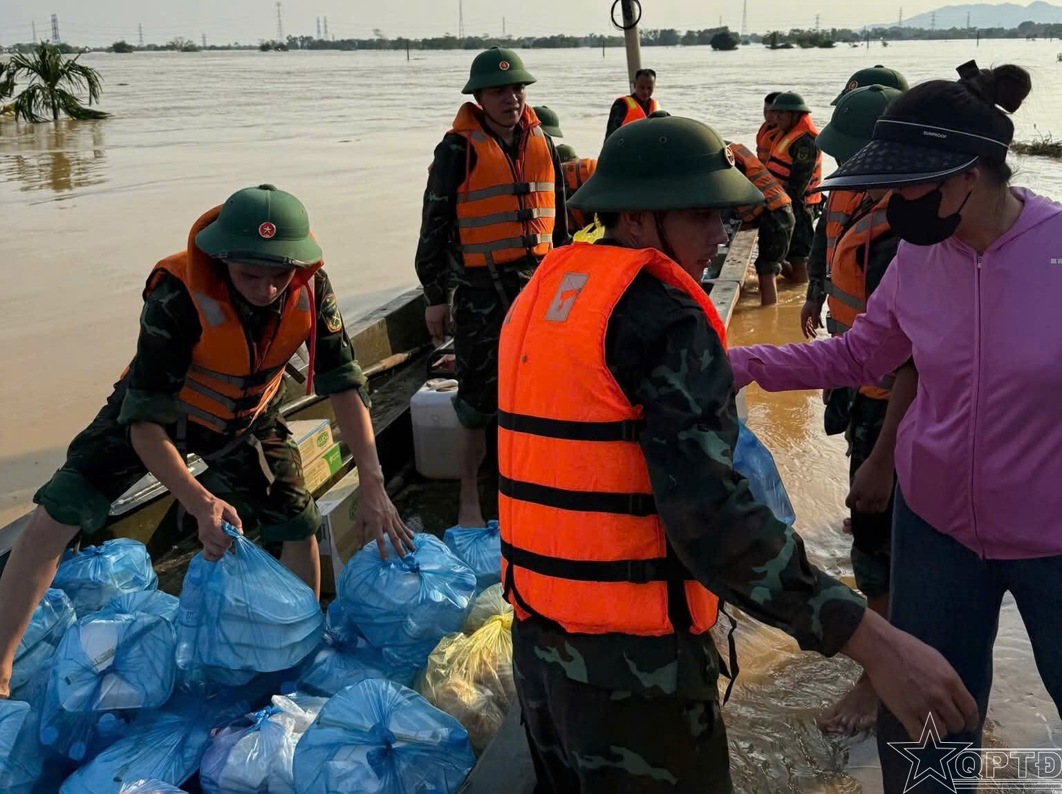Tiếp tế lương thực, thực phẩm cho người dân bị lũ lụt chia cắt.