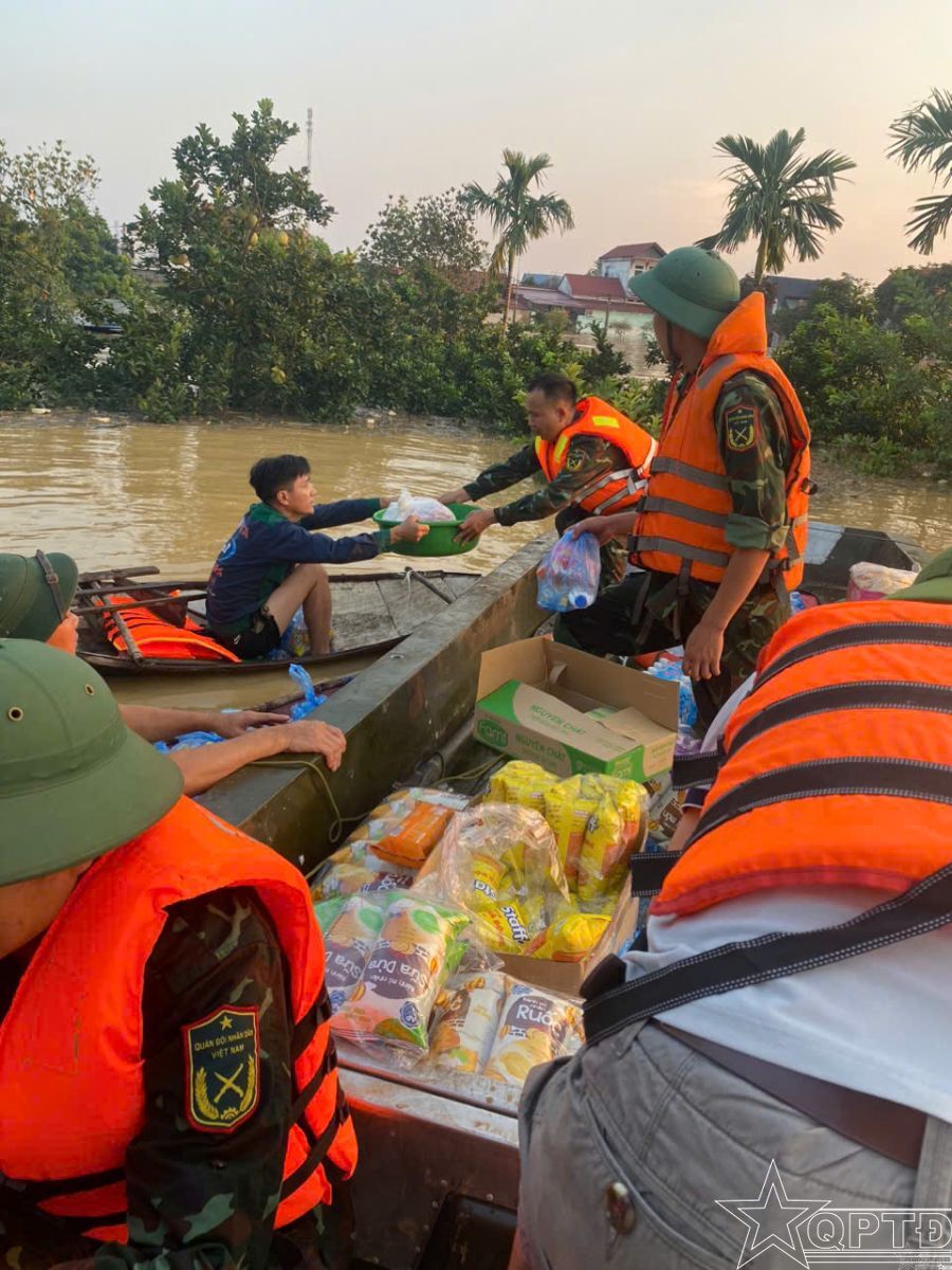 Cán bộ, chiến sĩ Trung đoàn 692 vận chuyển lương thực, nhu yếu phẩm cho bà con vùng lũ.