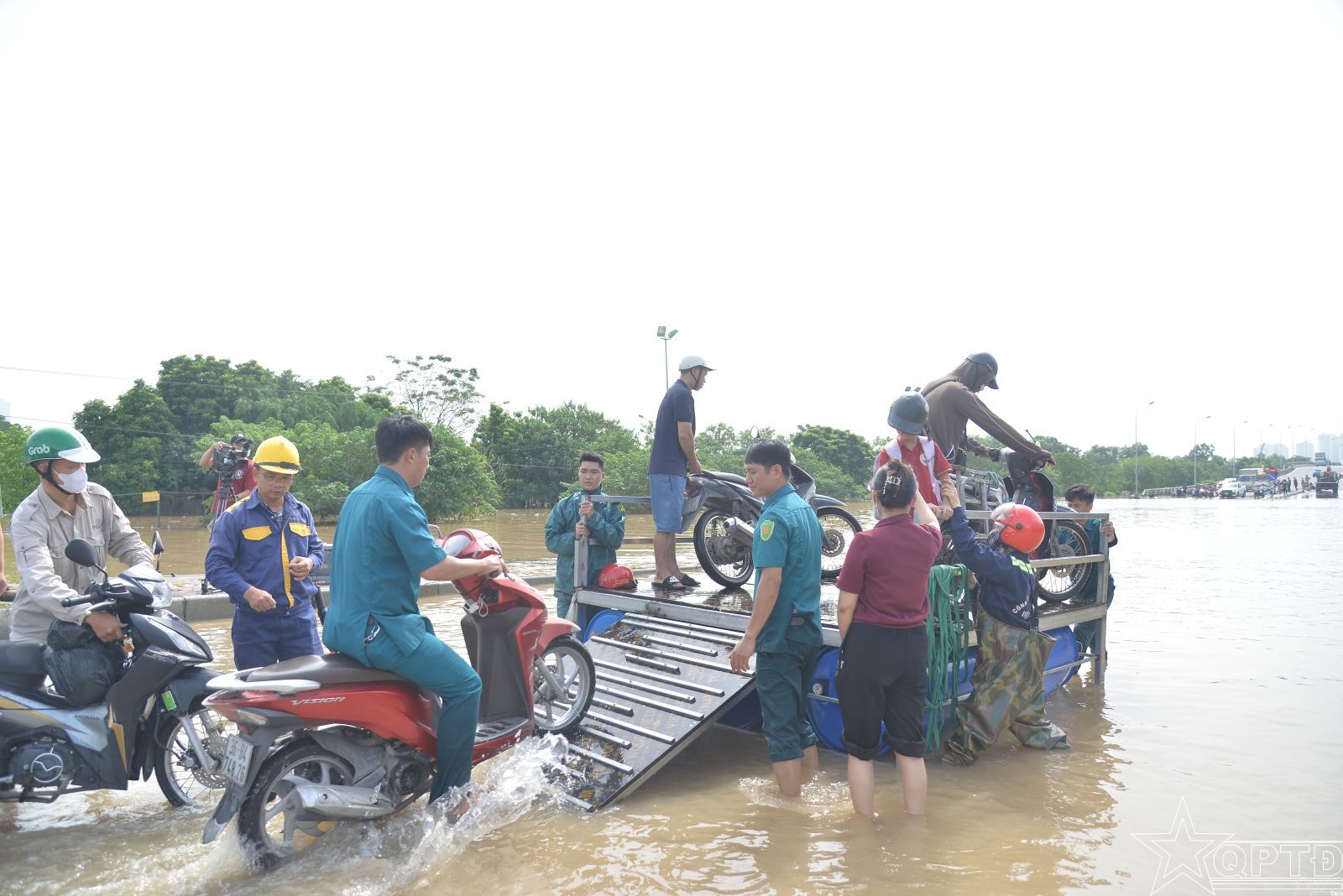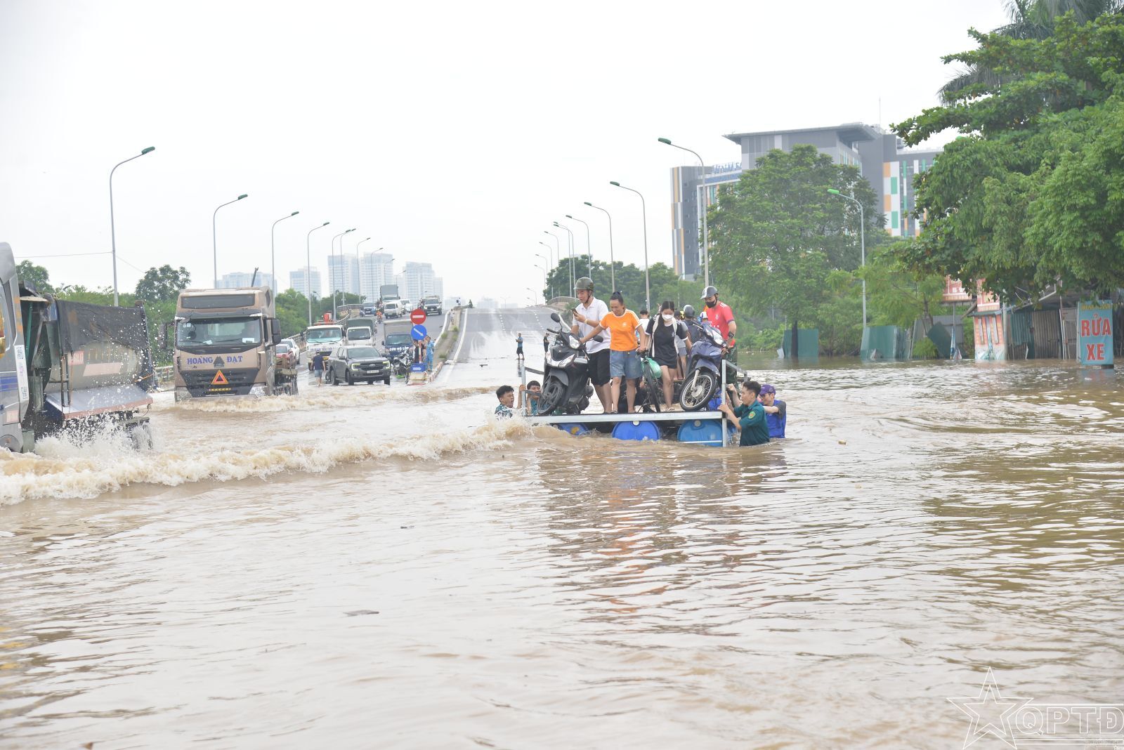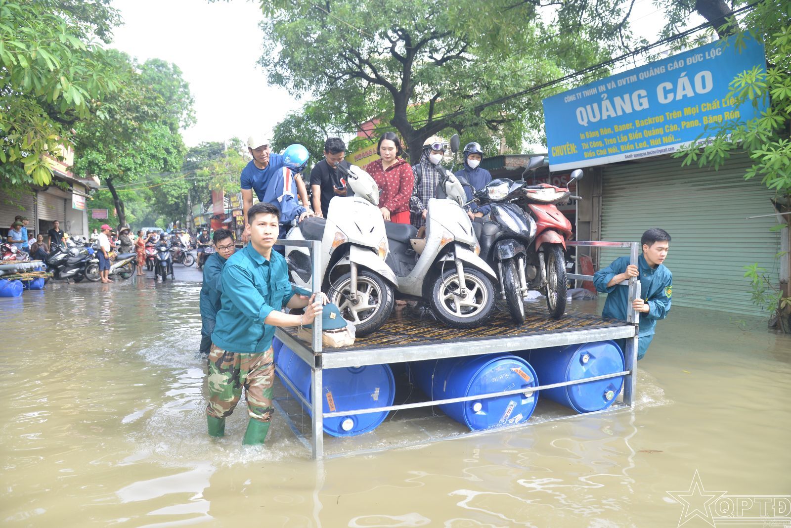 Từ thực tế tình hình ngập úng tại khu vực chân Cầu Ngà, Ban CHQS phường đã chế tạo hai chiếc bè đặc biệt, có thể vừa di chuyển được trên mặt nước, vừa kéo đẩy được trên cạn để giúp người dân vượt qua khu vực ngập úng.