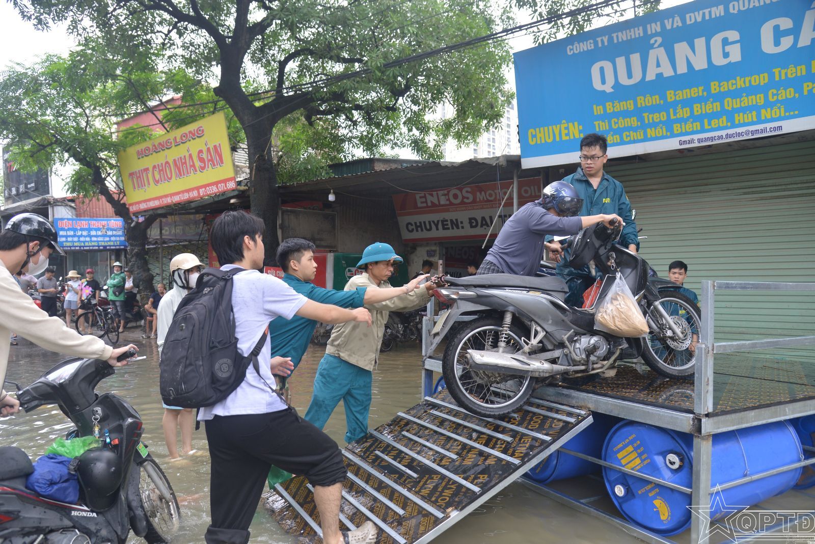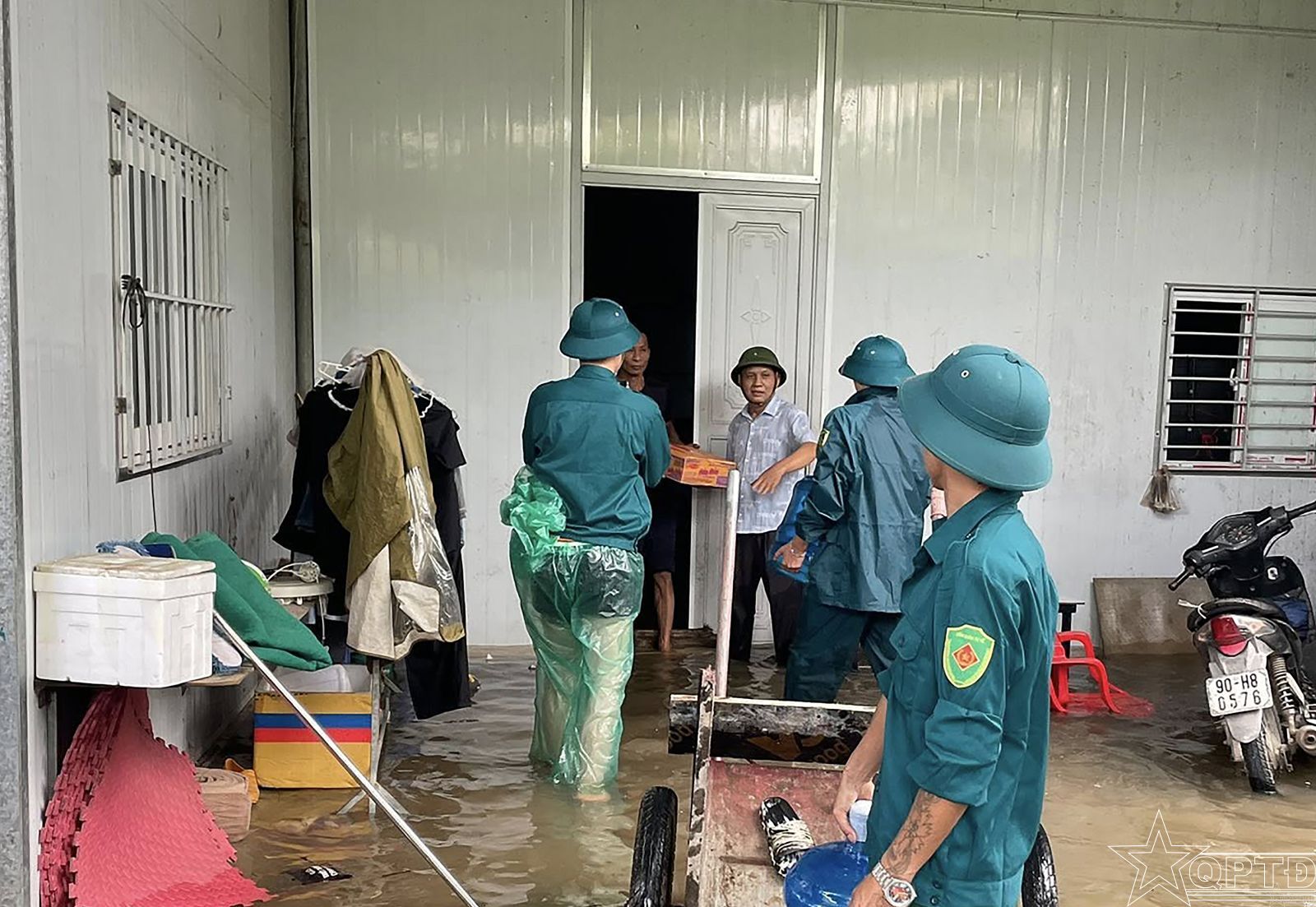 Vận chuyển nước uống và hàng cứu trợ đến tay người dân bị ngập úng.