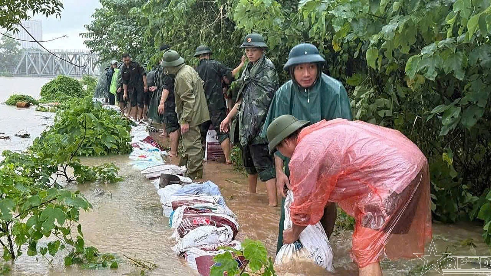 QPTĐ-Hoàn lưu của cơn bão số 11 đã gây mưa lớn và ngập sâu tại nhiều khu vực trên địa bàn phường Xuân Phương, thành phố Hà Nội. Khu vực chân cầu Ngà ngập sâu từ 0,5 đến 1 mét khiến việc đi lại của người dân gặp nhiều khó khăn, các phương tiện giao thông không thể đi qua. Trước tình hình đó, Ban CHQS phường Xuân Phương đã kịp thời huy động lực lượng dân quân hỗ trợ người dân đi qua vùng ngập úng.