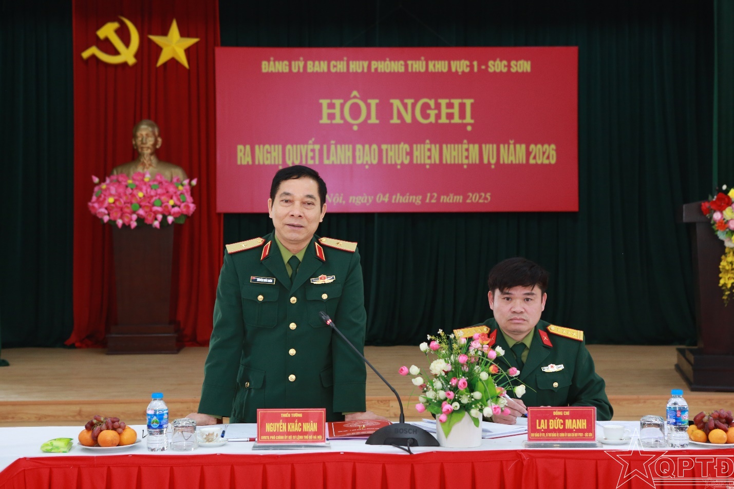 Phát biểu chỉ đạo hội nghị Thiếu tướng Nguyễn Khắc Nhân ghi nhận và đánh giá cao những cố gắng, nỗ lực, trách nhiệm của cán bộ, nhân viên Ban CHPTKV 1-Sóc Sơn trong thực hiện các nhiệm vụ ngay từ những ngày đầu, tháng đầu được thành lập. Cùng với đó, đồng chí Phó Chính uỷ đề nghị Ban CHPTKV 1 tiếp tục phát huy những thành tích đã đạt được và với tinh thần đoàn kết, chủ động, quán triệt và cụ thể hóa các chỉ tiêu nghị quyết của cấp trên vào cấp mình để thực hiện đồng bộ, chất lượng đạt hiệu quả cao; nâng cao năng lực tham mưu, phối hợp chặt chẽ với cấp ủy, chính quyền 11 xã trên địa bàn hoàn thành tốt nhiệm vụ công tác quân sự, quốc phòng; tập trung xây dựng lực lượng vững mạnh, giữ vững an ninh chính trị, trật tự an toàn xã hội, đáp ứng tốt yêu cầu nhiệm vụ trong tình hình mới; đặc biệt, chủ động xây dựng kế hoạch, tổ chức thực hiện tốt nhiệm vụ diễn tập tác chiến phòng thủ khu vực năm 2026 và tập trung phối hợp, hướng dẫn Ban CHQS các xã làm tốt diễn tập tác chiến phòng thủ, duy trì nền nếp chế độ trực SSCĐ, trực chỉ huy, trực ban; hoàn thành công tác tuyển chọn và gọi công dân nhập ngũ năm 2026 bảo đảm chất lượng.