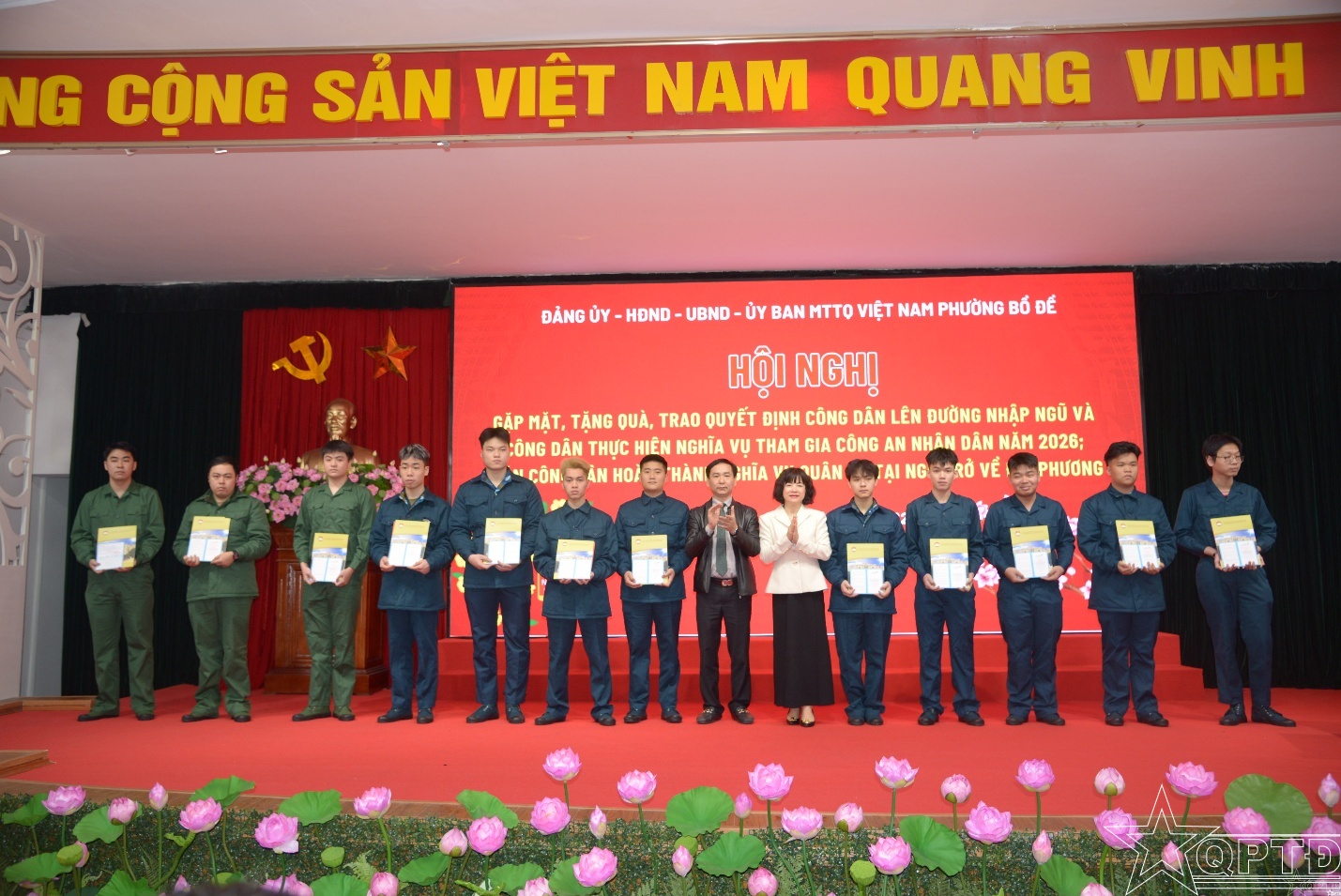 QPTĐ-Chiều 13-2, phường Bồ Đề đã tổ chức gặp mặt, tặng quà, trao quyết định cho công dân lên đường nhập ngũ và công dân thực hiện nghĩa vụ tham gia Công an nhân dân năm 2026, quân nhân hoàn thành nghĩa vụ quân sự tại ngũ, trở về địa phương.