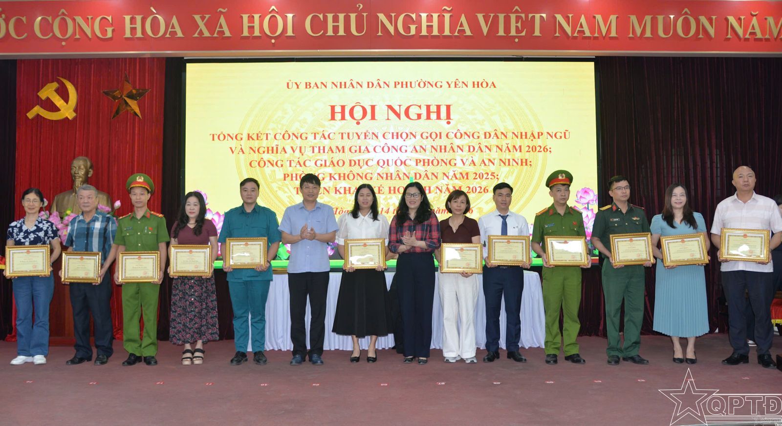 Dịp này, UBND phường Yên Hoà đã tặng Giấy khen cho các tập thể và cá nhân có thành tích tiêu biểu trong công tác tuyển chọn, gọi công dân nhập ngũ và thực hiện nghĩa vụ tham gia Công an nhân dân năm 2026.