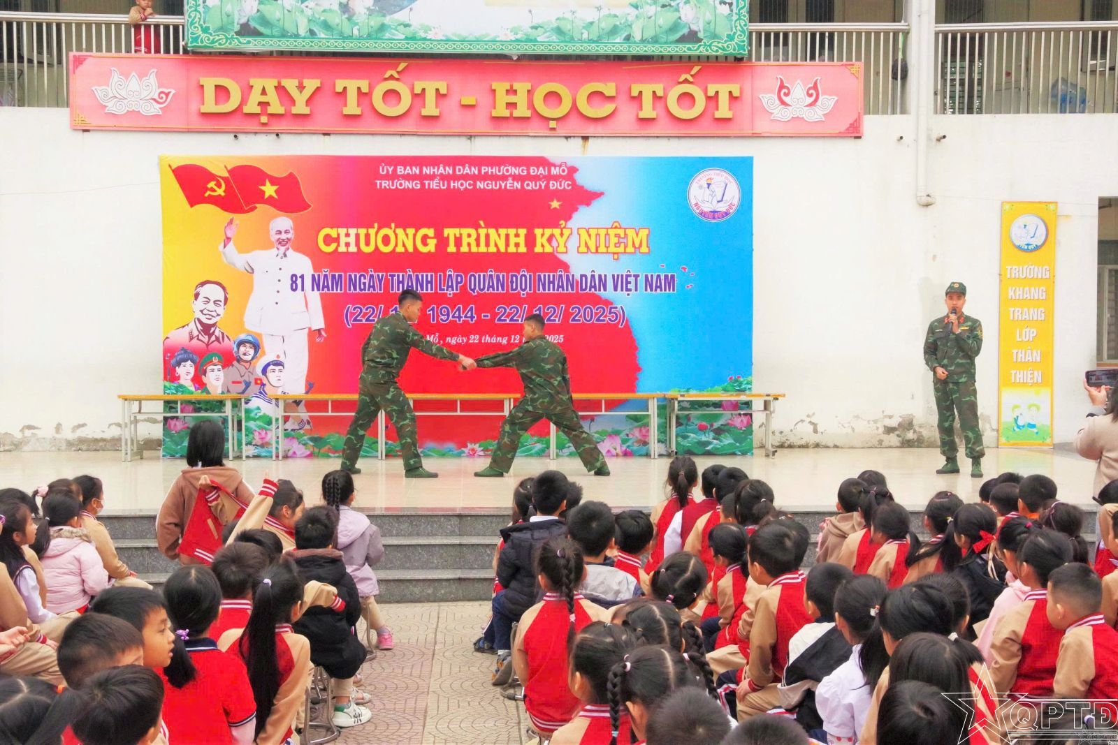 Một nội dung được địa phương và nhân dân đánh giá cao là việc Tiểu đoàn 18 Đặc công tích cực phối hợp với các nhà trường trên địa bàn tổ chức nhiều hoạt động thiết thực, ý nghĩa. Tại Trường Phổ thông cơ sở Xã Đàn, cán bộ, chiến sĩ đơn vị đã tổ chức tập huấn một số kỹ năng phòng vệ cho học sinh; hướng dẫn các em cách gấp chăn màn đúng quy định; tổng dọn vệ sinh, trồng mới và củng cố cảnh quan khuôn viên nhà trường. Đặc biệt, đơn vị đã phối hợp làm mới khu vực nhà để xe, sắp xếp lại hệ thống kho vật chất và cải tạo hành lang thành thư viện mở, tạo không gian học tập thân thiện, hiệu quả cho học sinh. Tại Trường Tiểu học Nguyễn Quý Đức và Trường Tiểu học Mai Động, cán bộ, chiến sĩ tổ chức tập huấn kỹ năng phòng vệ, hướng dẫn các động tác điều lệnh đội hình đội ngũ; đồng thời phối hợp tổng dọn vệ sinh, sắp đặt vật chất, củng cố cảnh quan nhà trường. Những việc làm cụ thể ấy không chỉ góp phần cải thiện cơ sở vật chất mà còn gieo vào lòng các em học sinh tình cảm yêu mến, trân trọng hình ảnh Bộ đội Cụ Hồ. Ông Nguyễn Đắc Thắm, người dân Tổ dân phố số 1 Ngọc Trục, phường Đại Mỗ, cho biết: “Qua đợt ra quân, đường phố sạch sẽ hơn, trật tự đô thị được lập lại. Bộ đội không chỉ trực tiếp tham gia lao động mà còn tuyên truyền rất gần gũi, dễ hiểu, nên bà con đồng tình, ủng hộ và tự giác chấp hành”.
