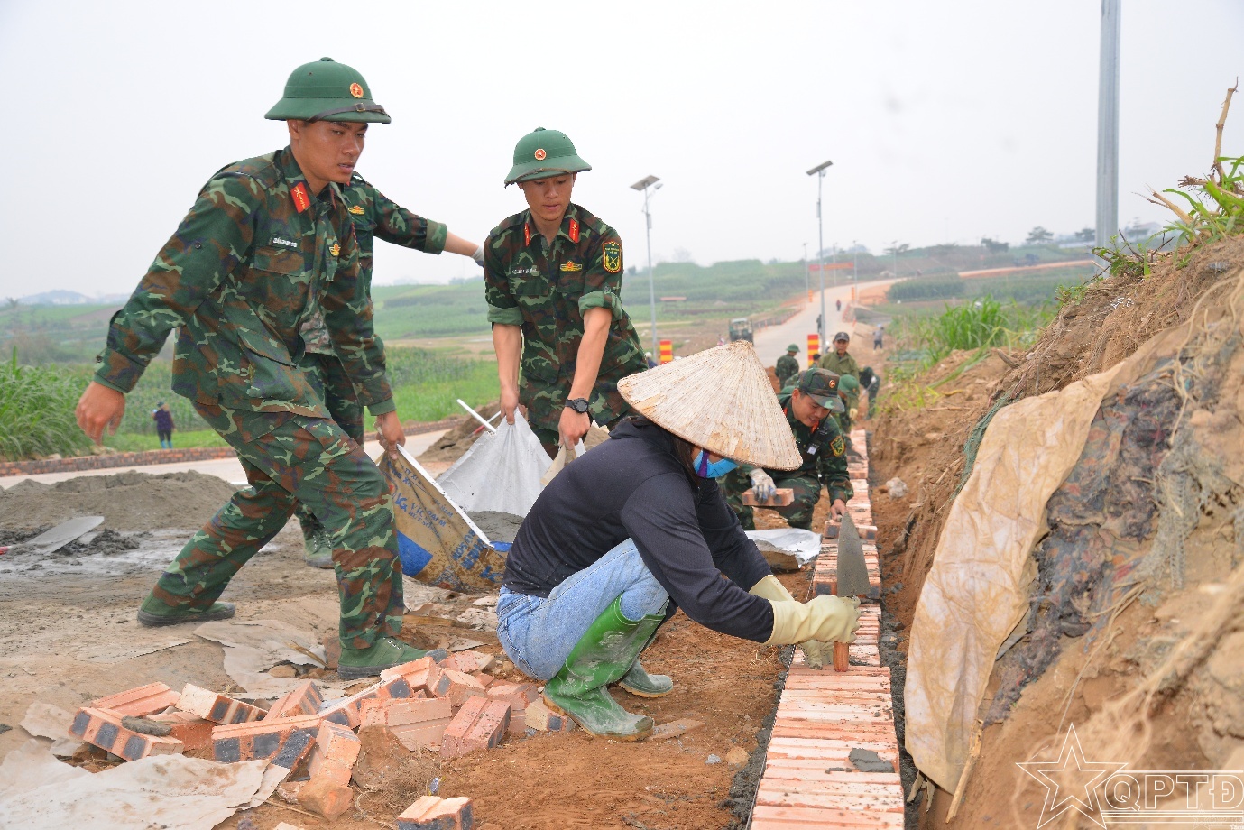 Tại công trường xây dựng bờ be mở rộng tuyến đường bộ duy nhất vào xã, ghi nhận cho thấy, bên cạnh những tổ, đội bộ đội công binh, dễ dàng bắt gặp các thợ xây trong xã tham gia phụ giúp. Người trộn vữa, người xếp gạch, người chỉnh lại từng viên gạch cho thẳng, cho chắc. Thậm chí, một số nhân dân là nữ biết xây cũng tự nguyện mua dao xây tham gia cùng bộ đội đẩy nhanh tiến độ. Ông Nguyễn Văn Hậu, thợ xây ở thôn Chu Châu, vừa thoăn thoắt xúc cát vừa chia sẻ: “Chúng tôi làm nghề xây dựng quen rồi, thấy bộ đội về làm đường cho dân, khối lượng công việc nhiều, vất vả quá nên anh em bảo nhau ra giúp. Không ai tính công, tính thợ gì cả, chỉ mong con đường sớm hoàn thành”.