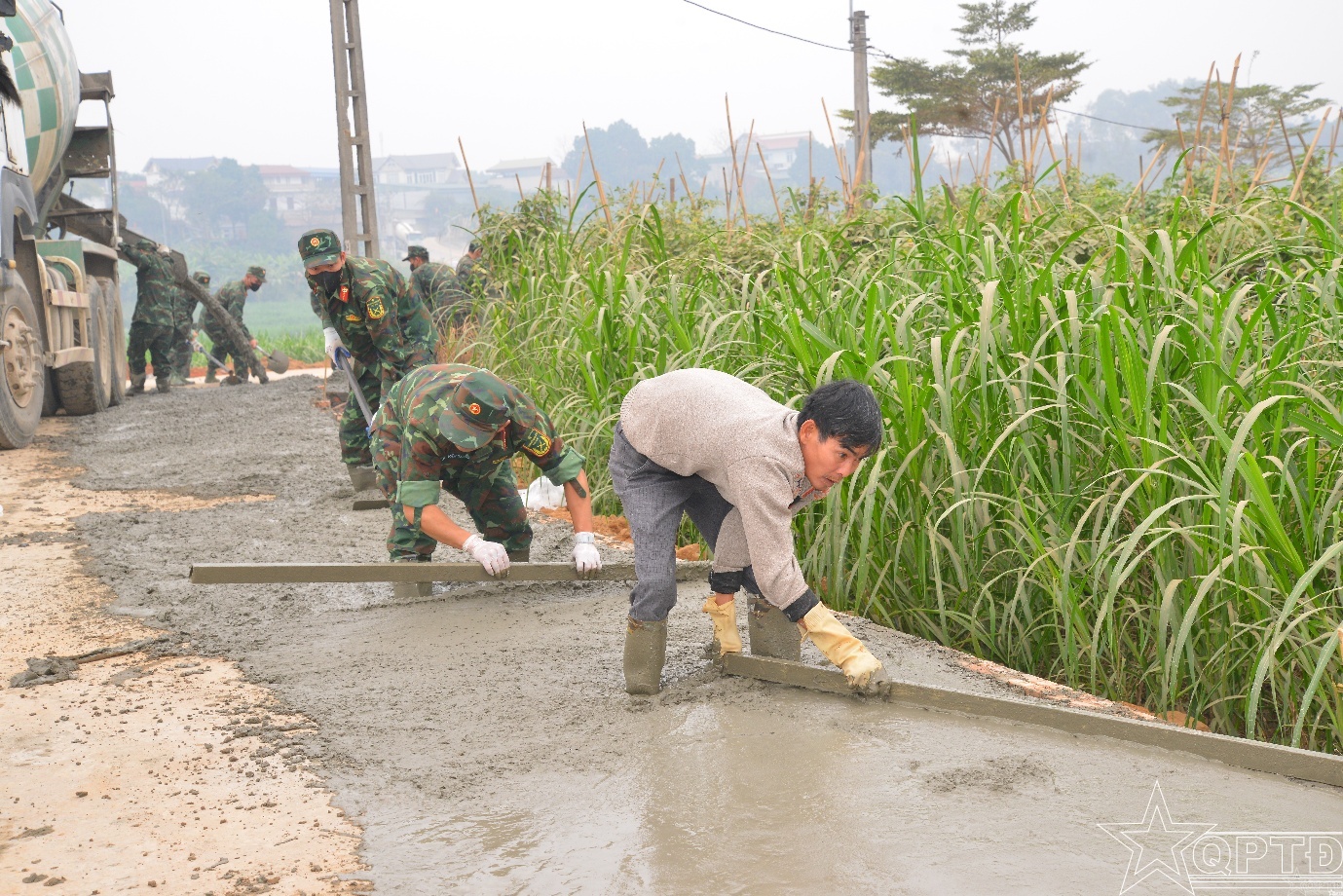 Nhân dân hỗ trợ cán bộ, chiến sĩ san bê tông mở rộng đường.