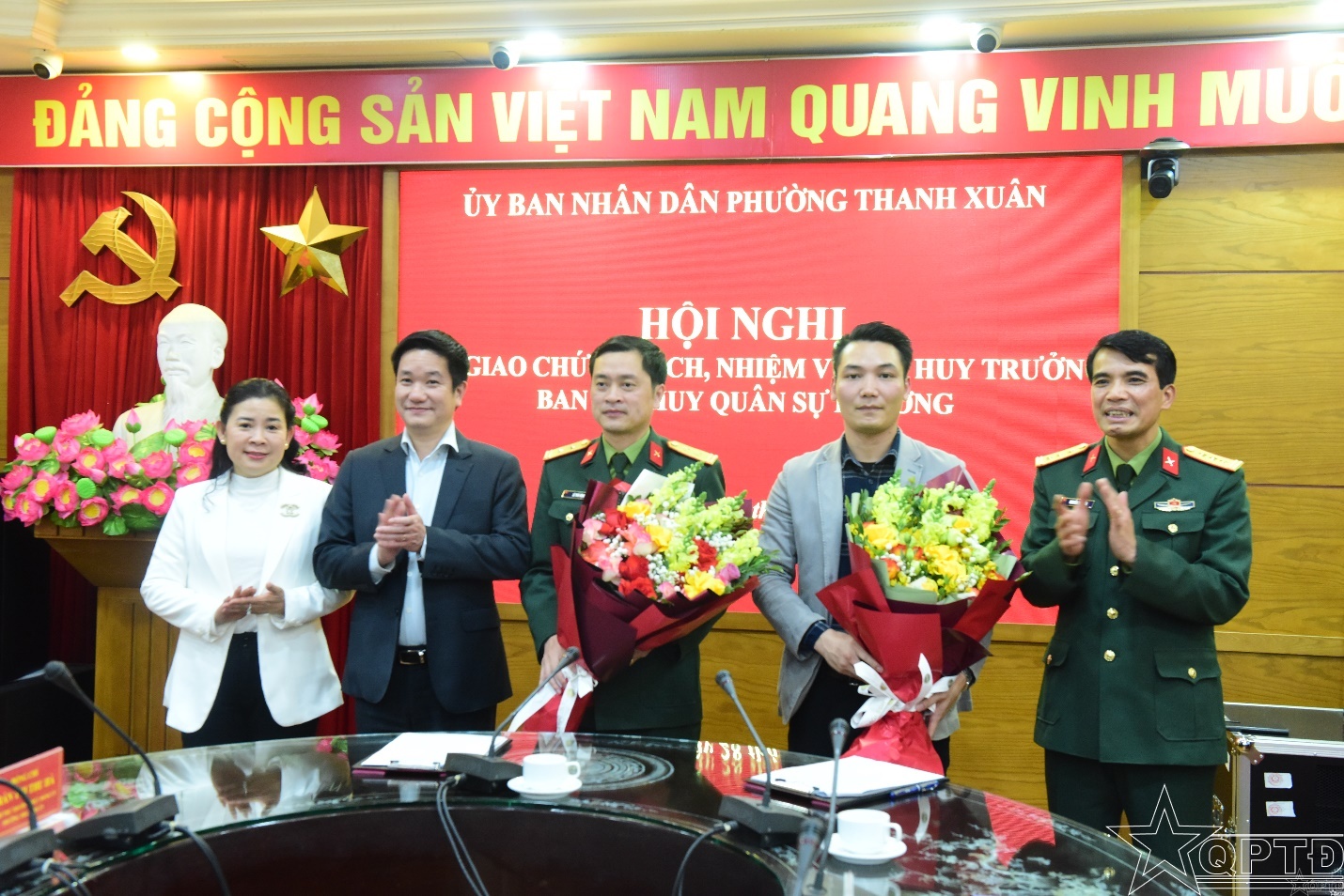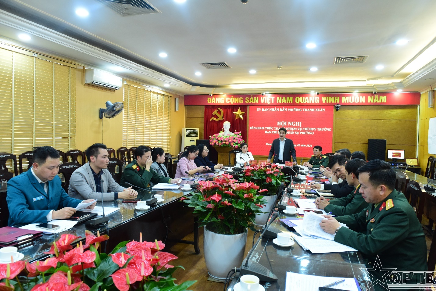 QPTĐ-Chiều 28-1, phường Thanh Xuân tổ chức hội nghị bàn giao nhiệm vụ Chỉ huy trưởng Ban CHQS phường. Dự và chỉ đạo hội nghị có đồng chí Nguyễn Huy Cường, Bí thư Đảng ủy, Chủ tịch HĐND phường; đồng chí Đỗ Quang Dương, Phó Bí thư Đảng ủy, Chủ tịch UBND phường; Thượng tá Nguyễn Bá Chiến, Bí thư Đảng ủy, Chính ủy Ban Chỉ huy PTKV 3-Hồng Hà.