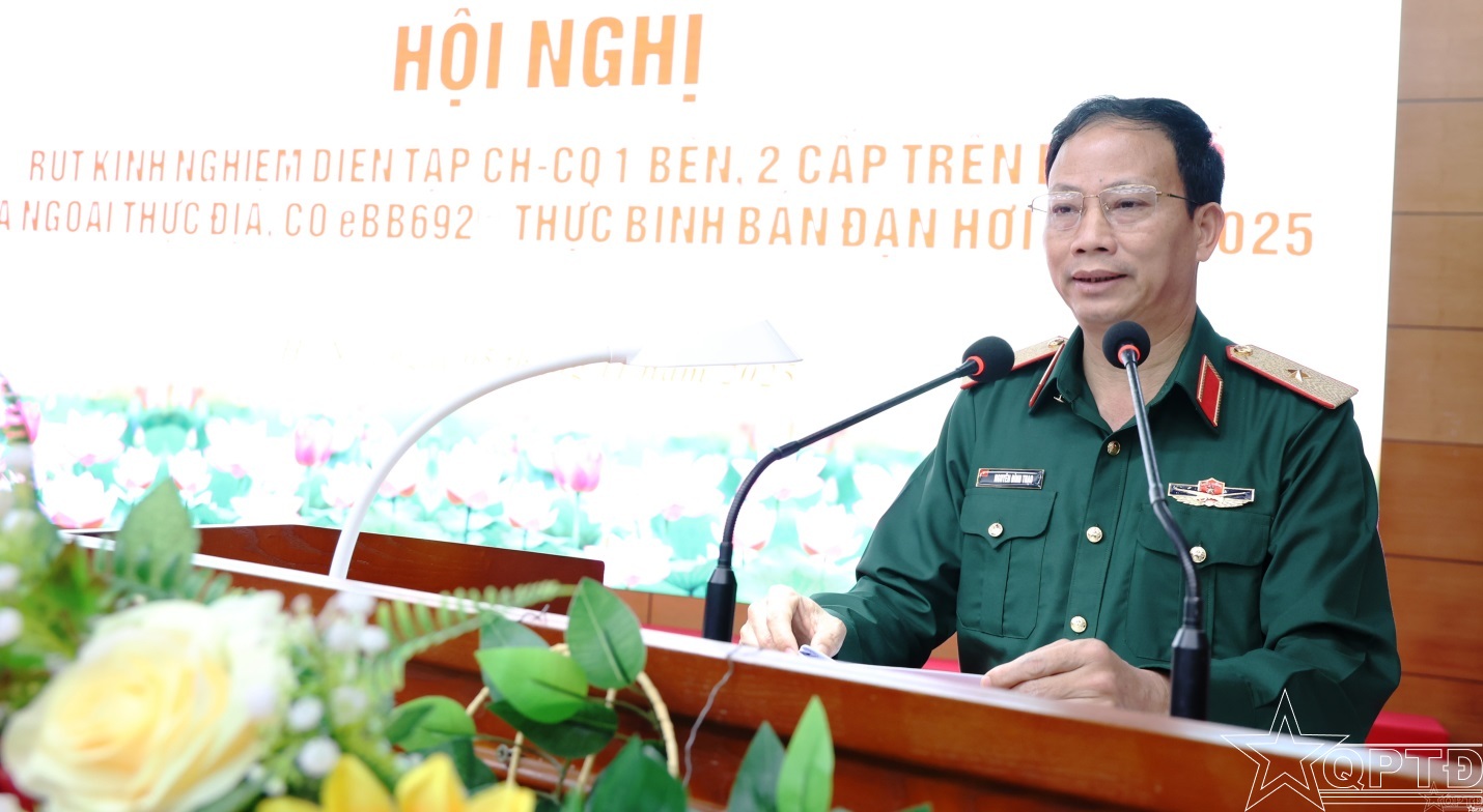 Phát biểu chỉ đạo hội nghị, Thiếu tướng Nguyễn Đình Thạo ghi nhận và biểu dương cán bộ, chiến sĩ Sư đoàn và các lực lượng đạo diễn, diễn tập đã phát huy tốt tinh thần trách nhiệm trong làm tốt công tác chuẩn bị và thực hành diễn tập, góp phần cho cuộc diễn tập của Sư đoàn đạt được mục đích, yêu cầu đề ra, chất lượng tốt, bảo đảm an toàn tuyệt đối về người và vũ khí, trang bị kỹ thuật. Rút kinh nghiệm để các cuộc diễn tập tới của Sư đoàn ngày càng hoàn thiện đạt chất lượng, đồng chí Phó Tư lệnh yêu cầu Sư đoàn cần khắc phục những hạn chế, tồn tại trong báo cáo đã đề cập, trong đó biện pháp hiệu quả là tăng cường tập huấn, bồi dưỡng cán bộ ngay từ đầu năm 2026, nhất là những hạn chế đã chỉ ra để đưa vào tập huấn khắc phục cho cán bộ; đồng thời, kiểm tra, rà soát thu hồi tất cả tài liệu diễn tập, tuyệt đối tránh không để lộ lọt; tập trung chỉ đạo hoàn thành các nhiệm vụ, tổng kết năm 2025 và chuẩn bị xây dựng kế hoạch thực hiện nhiệm vụ năm 2026. Tiếp tục duy trì nghiêm chế độ trực SSCĐ, rà soát bổ sung các phương án, bổ sung vật chất, phương tiện sẵn sàng thực hiện nhiệm vụ được giao; duy trì nghiêm chế độ huấn luyện, đẩy mạnh phong trào sáng kiến cải tiến kỹ thuật nâng cao chất lượng huấn luyện; tổ chức đánh giá tổ chức đảng và đảng viên, bình xét khen thưởng chặt chẽ, quản lý tốt tình hình tư tưởng cán bộ, chiến sĩ và đẩy mạnh công tác tăng gia sản xuất nâng cao đời sống bộ đội.