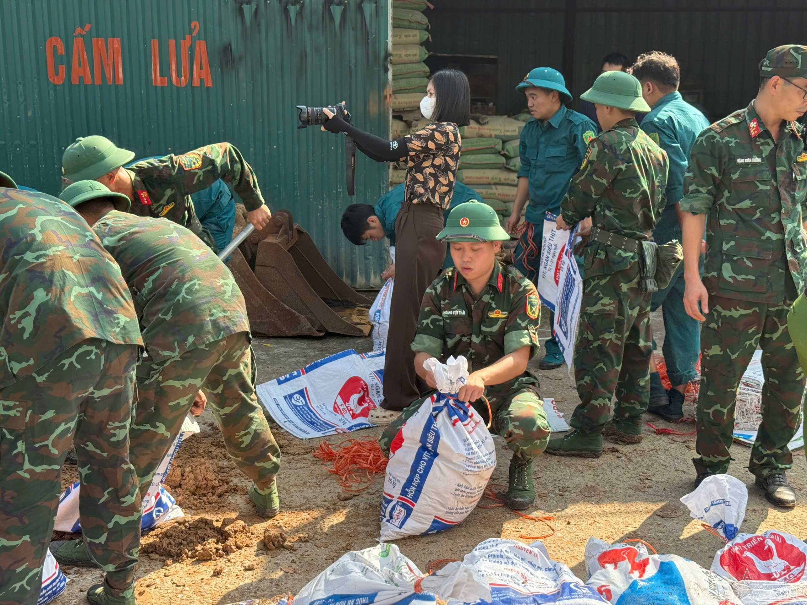 Cán bộ, chiến sĩ Tiểu đoàn Công binh 544 chuẩn bị bao cát để gia cố đê.