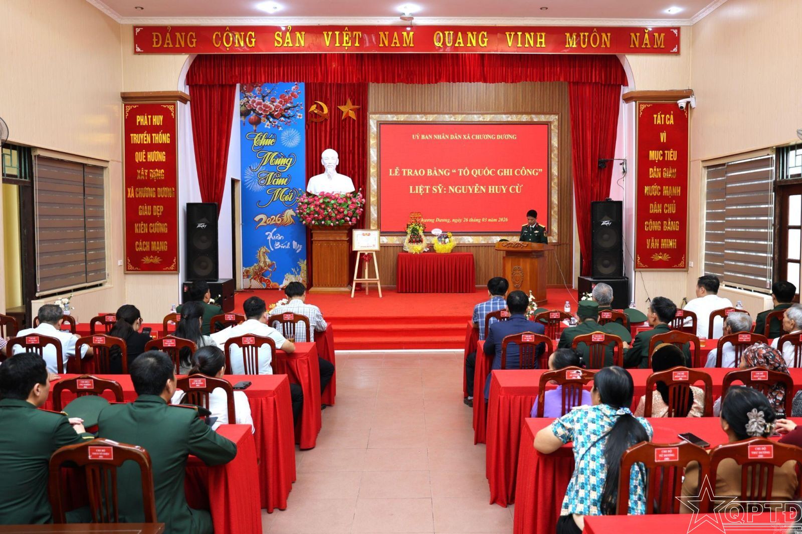 QPTĐ-Sáng 26/3, xã Chương Dương đã tổ chức Lễ trao Bằng Tổ quốc ghi công liệt sĩ Nguyễn Huy Cừ. Đây là sự ghi nhận và tôn vinh của Đảng, Nhà nước và Nhân dân đối với những người đã hy sinh vì nền độc lập, tự do của dân tộc.
