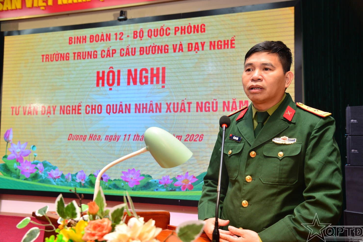 Cán bộ Trường Trung cấp Cầu đường và Dạy nghề Binh đoàn 12 tư vấn hướng nghiệp cho quân nhân xuất ngũ.