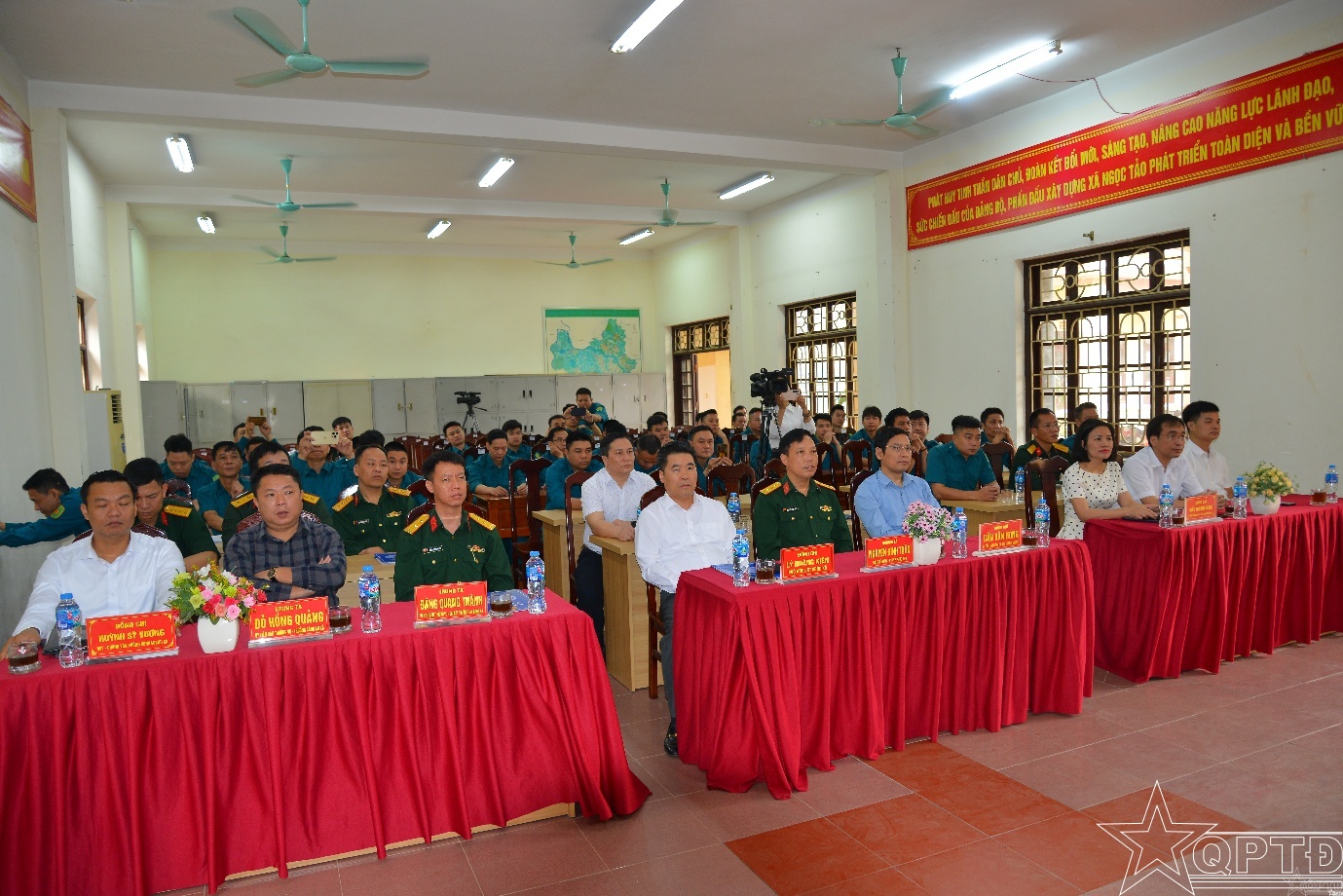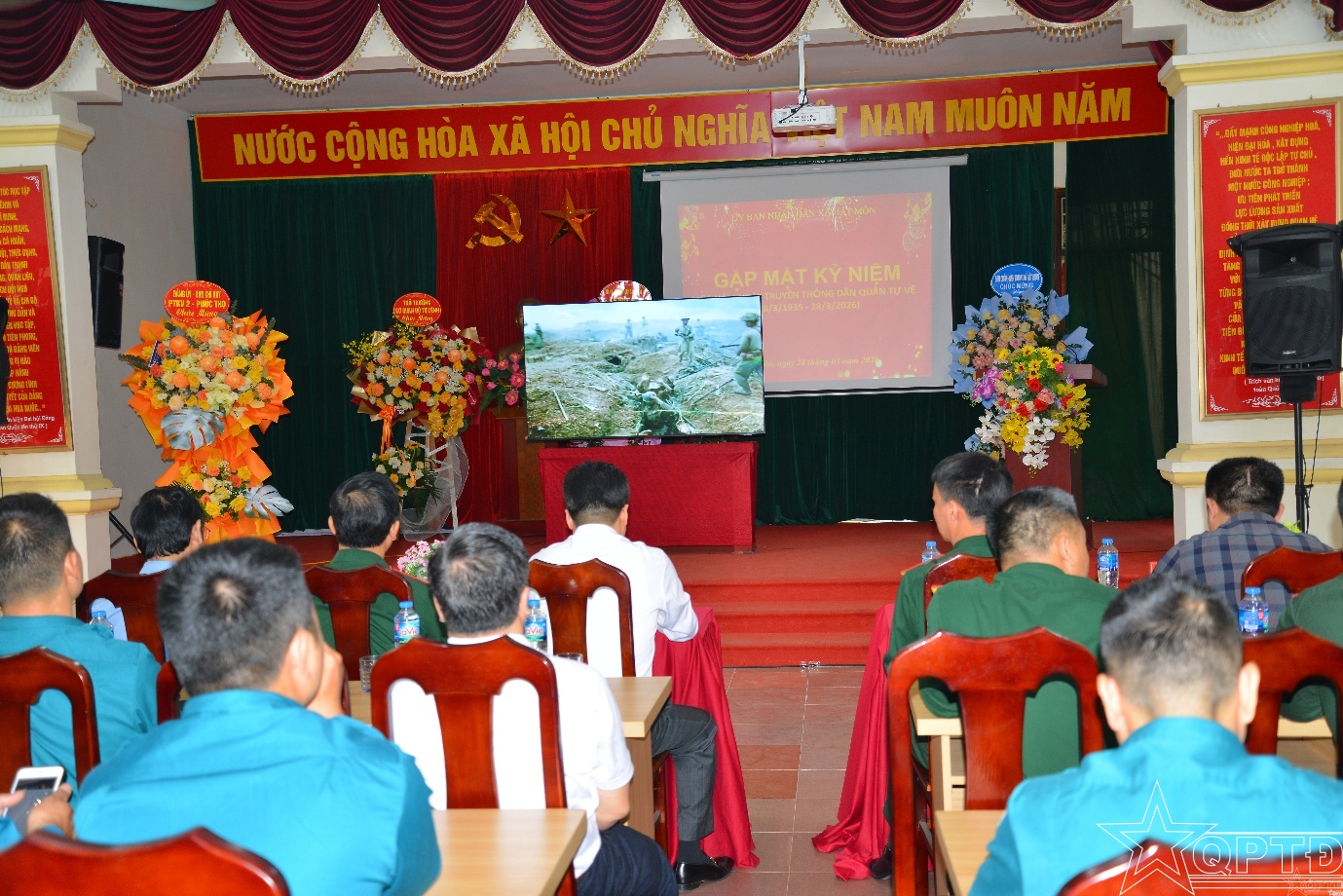 Các đại biểu xem video ôn lại truyền thống 91 năm xây dựng, chiến đấu và trưởng thành của lực lượng dân quân tự vệ Việt Nam.