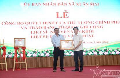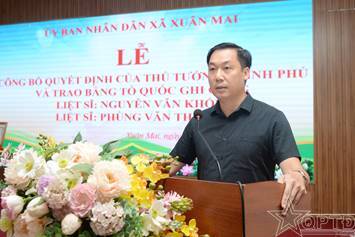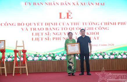 QPTĐ-Sáng 26-3, xã Xuân Mai, thành phố Hà Nội đã tổ chức Lễ Công bố quyết định của Thủ tướng Chính phủ và trao Bằng Tổ quốc ghi công liệt sĩ Nguyễn Văn Khối và liệt sĩ Phùng Văn Thuất.