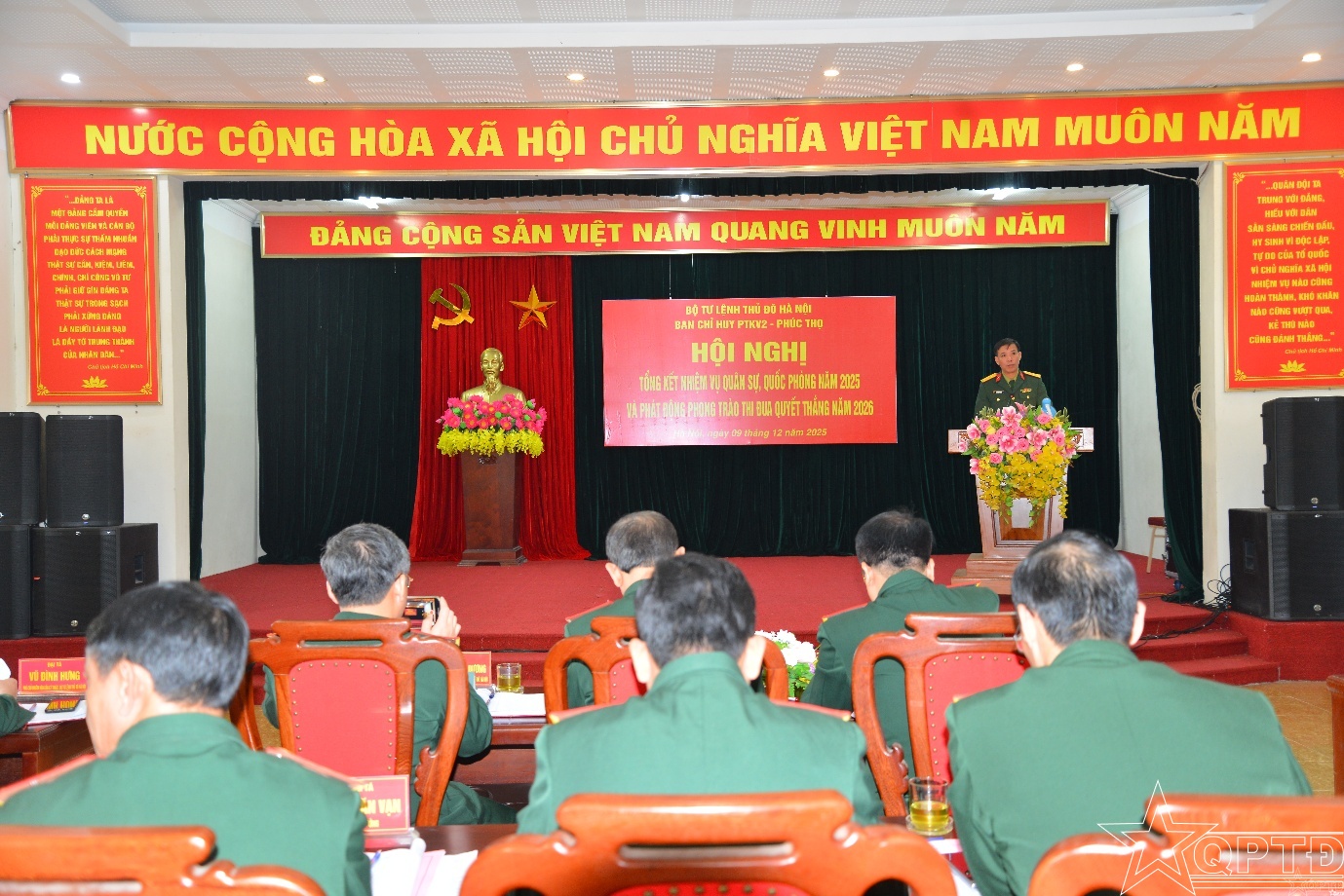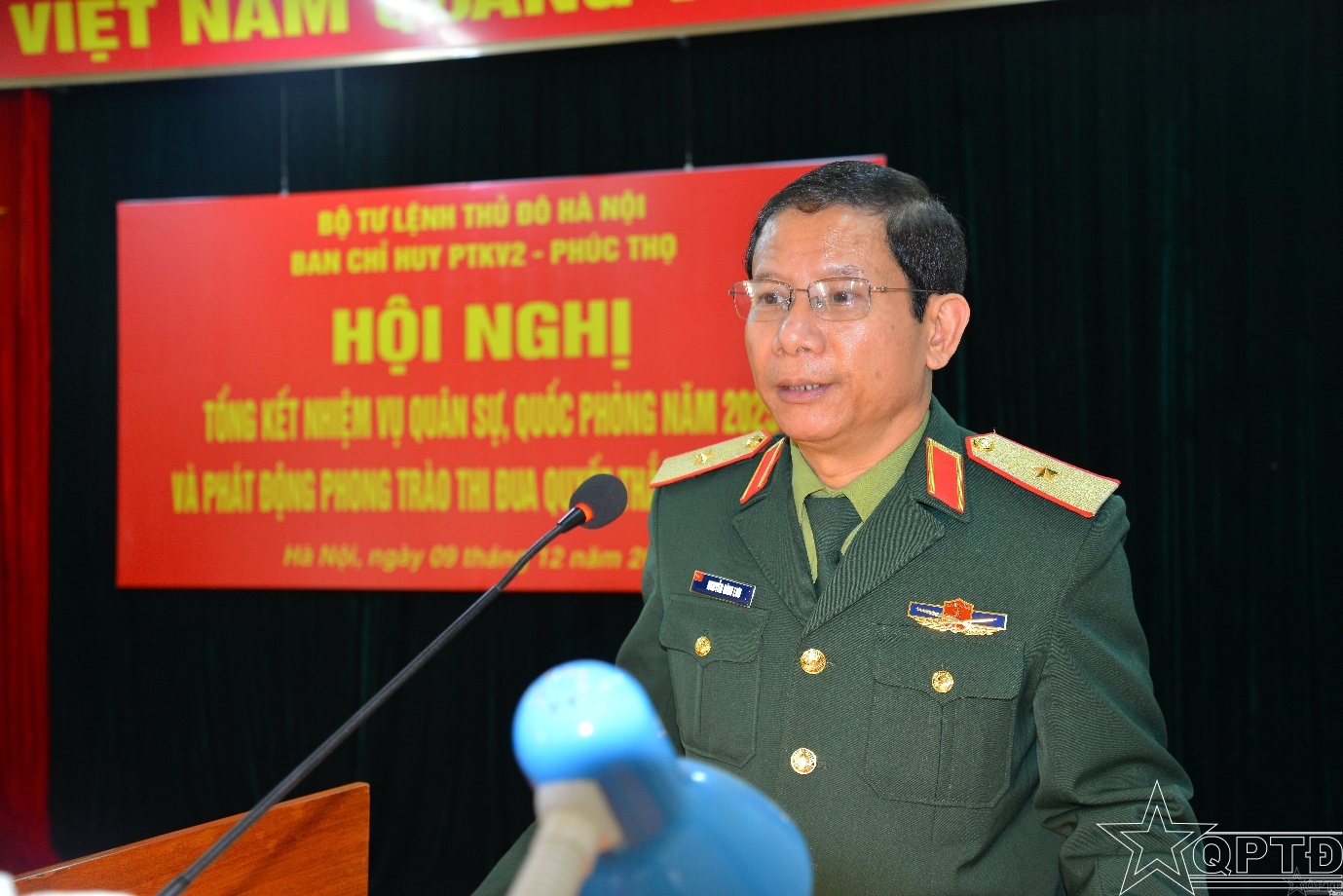 Phát biểu chỉ đạo, Thiếu tướng Nguyễn Đình Lưu, Phó Tư lệnh Bộ Tư lệnh Thủ đô Hà Nội đã ghi nhận và biểu dương nỗ lực, tinh thần đoàn kết, trách nhiệm của Ban Chỉ huy PTKV2 – Phúc Thọ trong năm 2025. Đồng chí nhấn mạnh dù đơn vị mới thành lập, địa bàn rộng, nhiệm vụ nhiều, song cán bộ, nhân viên, chiến sĩ đã đoàn kết vượt khó, thực hiện tốt công tác nắm tình hình, tham mưu xử lý các vấn đề phức tạp; duy trì SSCĐ; tổ chức diễn tập hiệu quả; xây dựng lực lượng dân quân, dự bị động viên vững chắc; thực hiện tốt nhiệm vụ phòng thủ dân sự, giúp dân khắc phục hậu quả thiên tai.