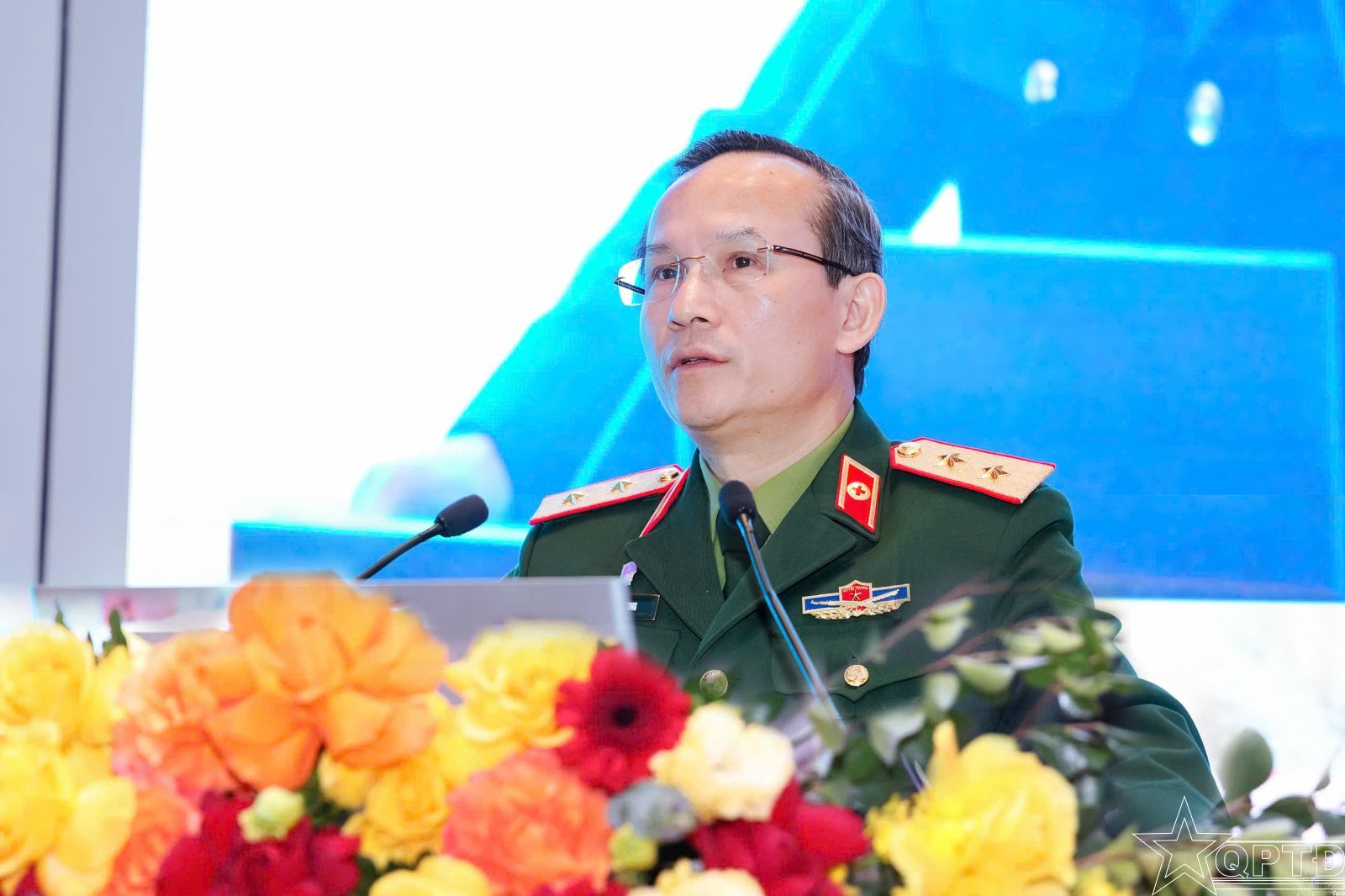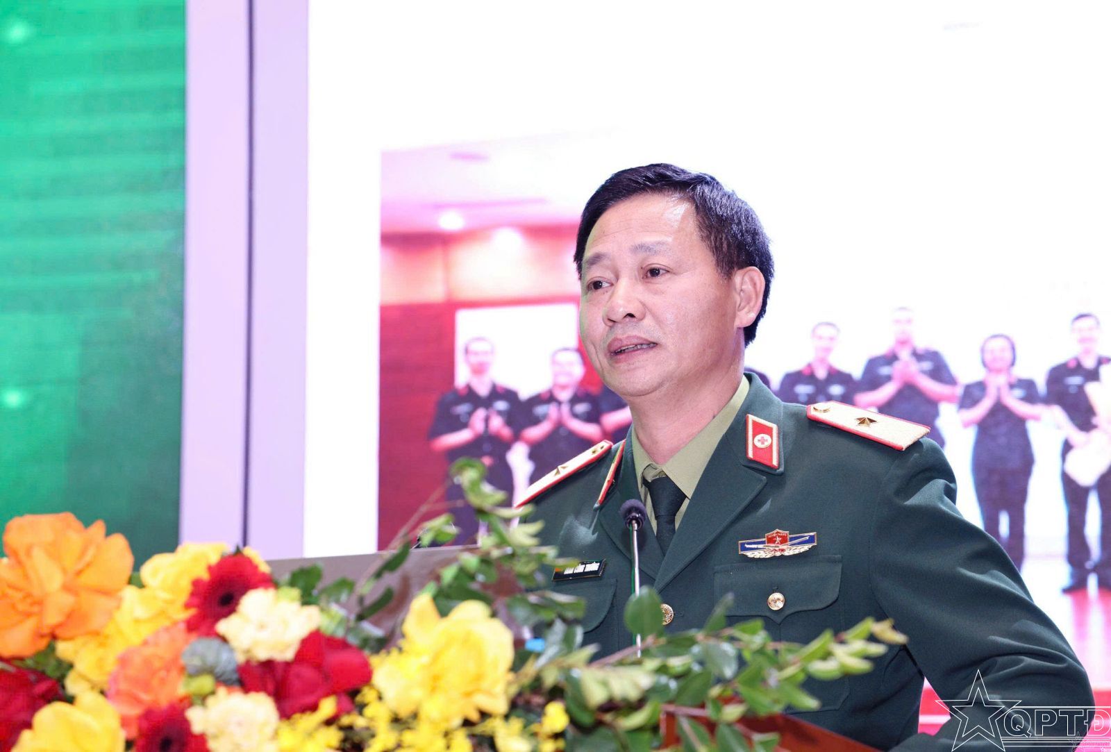 Trung tướng, GS, TS Lê Hữu Song, Phó Bí thư Đảng ủy, Giám đốc Bệnh viện phát biểu tại hội nghị.