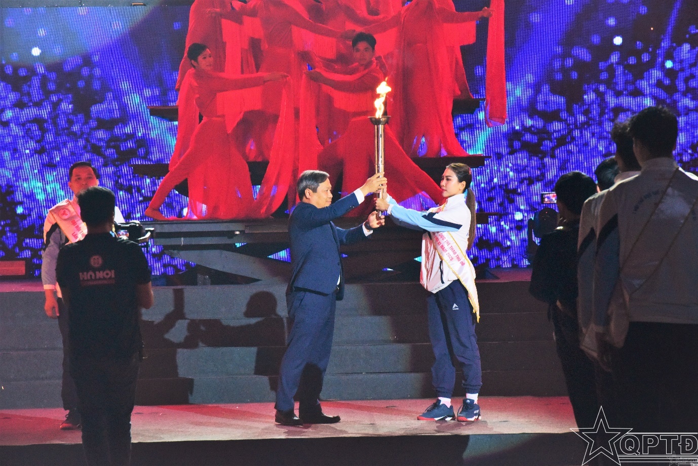 Chủ tịch UBND thành phố Hà Nội Vũ Đại Thắng trao đuốc lửa và cùng các vận động viên tiêu biểu thắp sáng đài đuốc Đại hội.