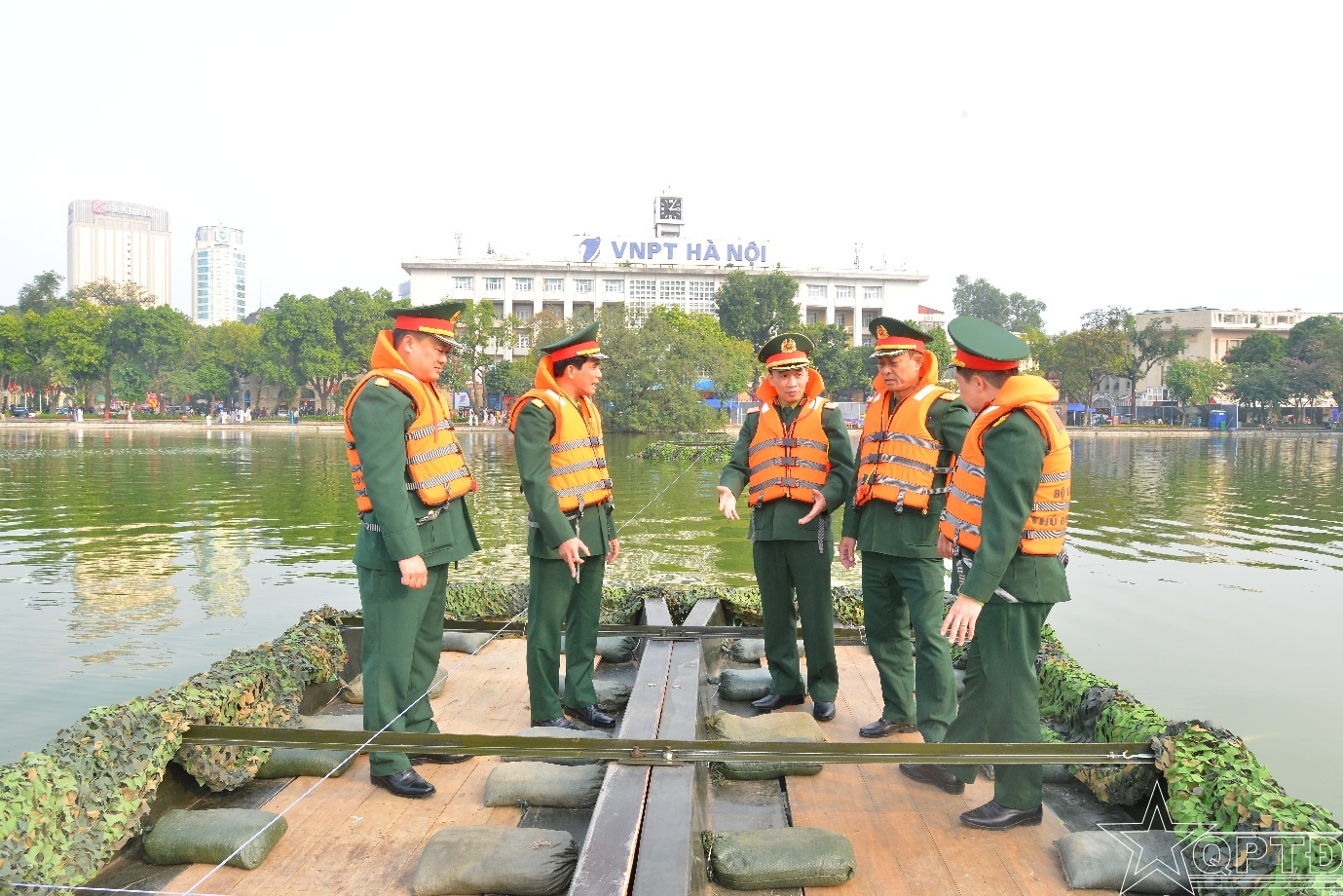 Đồng chí Chính ủy và đoàn công tác kiểm tra trận địa bắn pháo hoa hỏa thuật trên mặt Hồ Hoàn Kiếm.