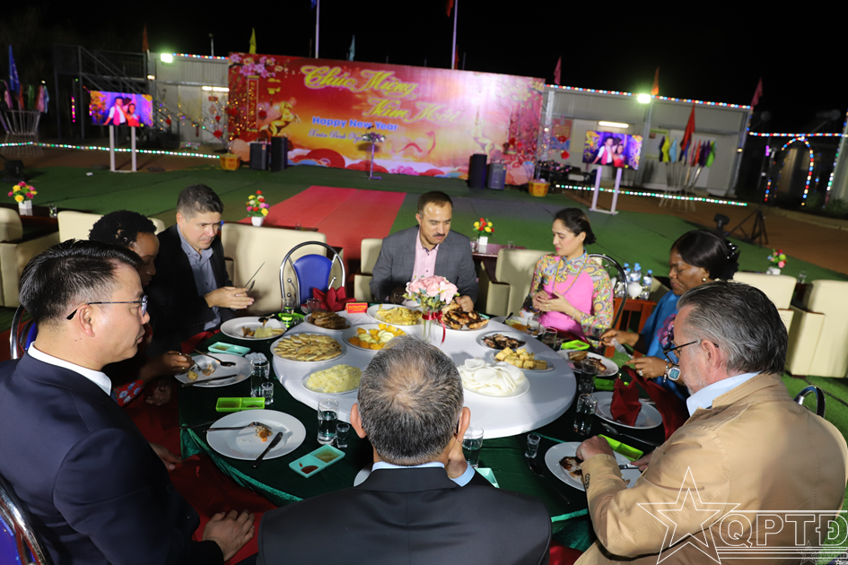 Sự hiện diện của những người lính mũ nồi xanh Việt Nam đã tạo nên một sức hút văn hóa đặc biệt, biến đại bản doanh Highway thực sự trở thành điểm hội tụ của tình hữu nghị đa quốc gia. Đúng vào ngày Mùng 1 Tết, đơn vị vinh dự được đón đoàn lãnh đạo cấp cao của Phái bộ UNISFA đến “xông đất”, dẫn đầu là Thiếu tướng Ganesh Kumar Shrestha - Tư lệnh Quân sự kiêm Quyền Trưởng Phái bộ UNISFA, cùng các ngài Phó Tư lệnh, Tham mưu trưởng và Tư lệnh Cảnh sát. Đặc biệt, chung vui trong ngày đầu năm còn có sự hiện diện đông đủ của các Trưởng cơ quan Phái bộ và Chỉ huy trưởng các đơn vị bạn đến từ Ấn Độ, Ghana, Nigeria, Trung Quốc, Pakistan, Bangladesh và Nepal. Bên mâm cỗ Xuân mang đậm hương vị quê hương, cuộc hội ngộ lịch sử này không chỉ dừng lại ở những lời chúc tụng, mà đã trở thành một nhịp cầu đối ngoại quốc phòng sâu sắc.