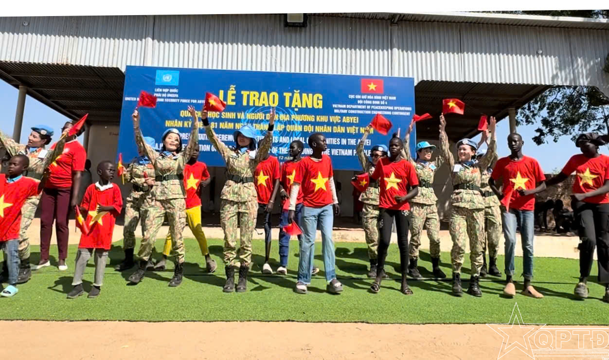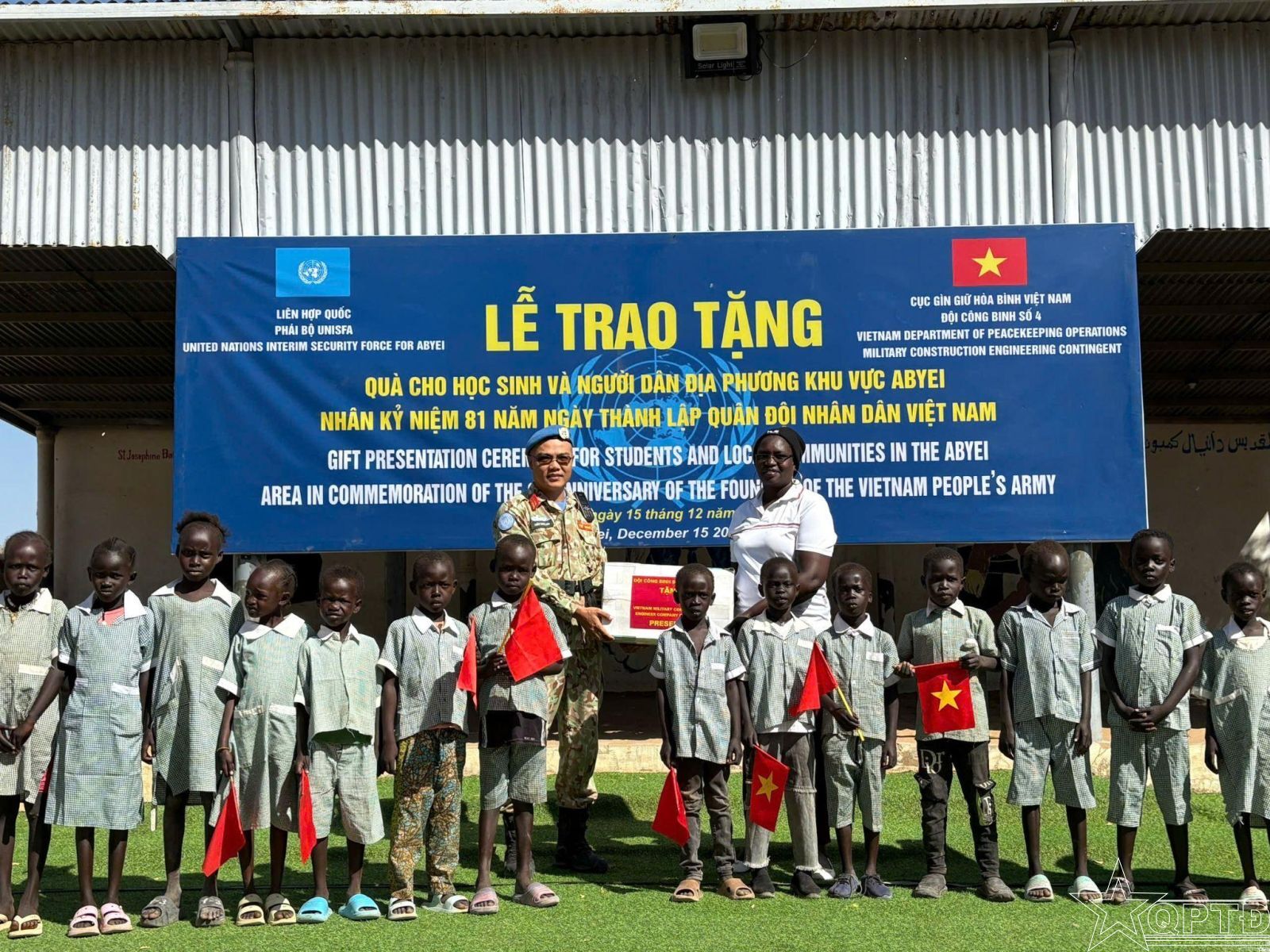 QPTĐ-Nhân kỷ niệm 81 năm Ngày thành lập Quân đội nhân dân Việt Nam, Đội Công binh số 4 đang thực hiện nhiệm vụ gìn giữ hòa bình tại khu vực Abyei, Phái bộ UNISFA đã tổ chức một chương trình trao quà thiết thực và ấm áp cho người dân địa phương.