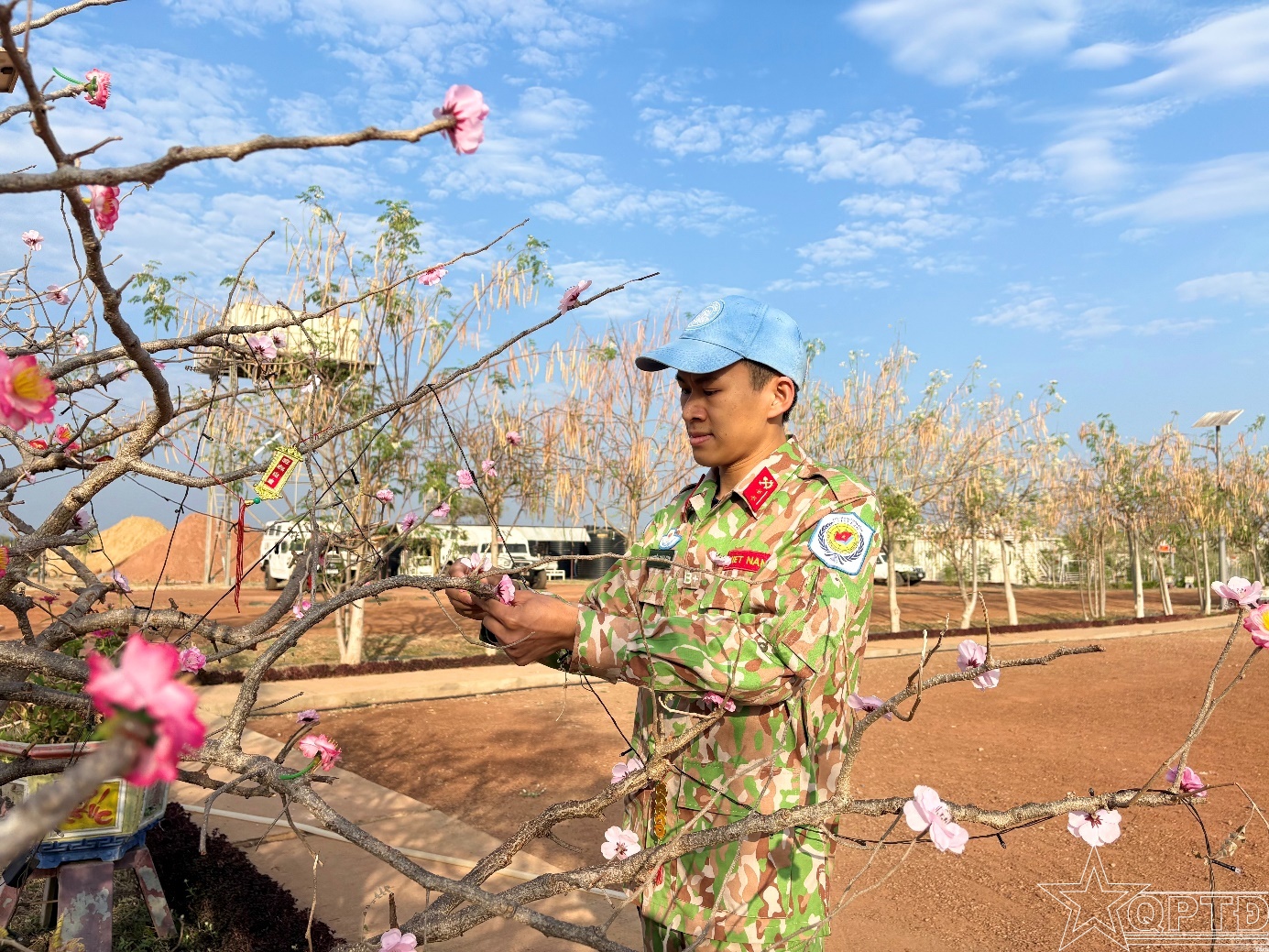Với những người lính trẻ lần đầu đón Tết xa Tổ quốc như Trung úy Nguyễn Trung Kiên, Phân đội Hậu cần - Bảo đảm, mùa Xuân này càng trở nên đặc biệt khi anh cùng đồng đội trực tiếp đảm nhiệm việc trang trí, mang diện mạo Tết về cho toàn đơn vị. Đứng giữa nắng cháy Abyei, đôi lúc Kiên không khỏi bồi hồi: “Tôi nhớ vị dưa hành của mẹ, nhớ cái lạnh se sắt đặc trưng của quê hương phương Bắc”. Thế nhưng, gác lại nỗi nhớ riêng, anh dồn hết tâm huyết vào nhiệm vụ “thổi hồn” Xuân cho căn cứ. Chính Kiên là người đã tỉ mẩn kết từng nhành đào từ giấy màu, biến những vật liệu khô khan thành những gốc đào thắm đỏ mang dáng hình quê hương. Dưới sự sẻ chia của 45 cán bộ “kỳ cựu”, hơi ấm đồng đội đã khỏa lấp tất cả, để bên nhành đào giấy đang dần khoe sắc, những người lính trẻ như Kiên thấy mình đang trưởng thành hơn trong từng nét cọ, từng đóa hoa gieo trên đất khó.