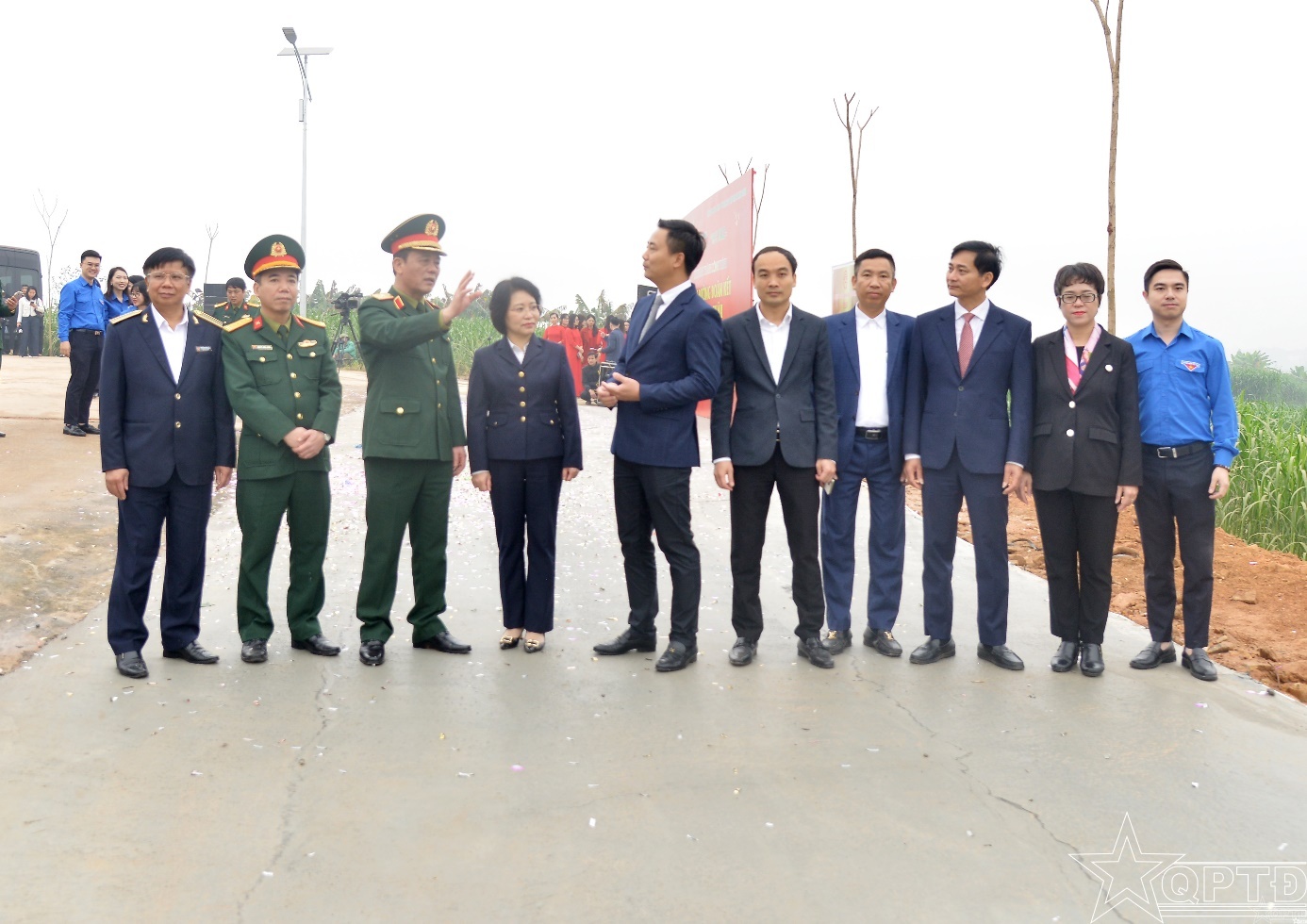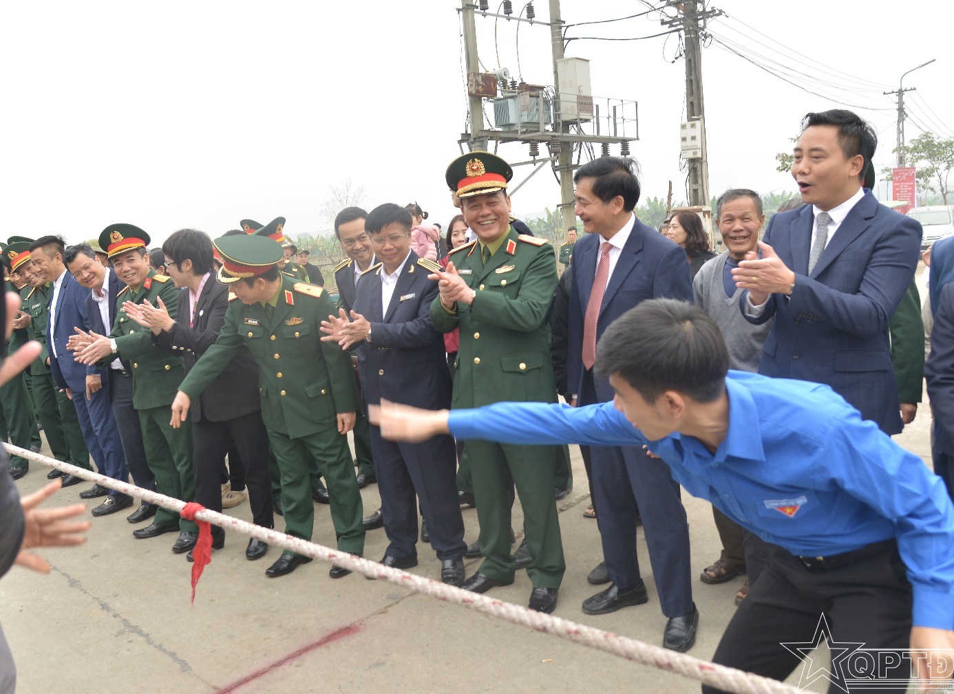 Thủ trưởng Bộ Tư lệnh Thủ đô Hà Nội và các đại biểu cắt băng khánh thành công trình con đường đoàn kết xã Minh Châu.