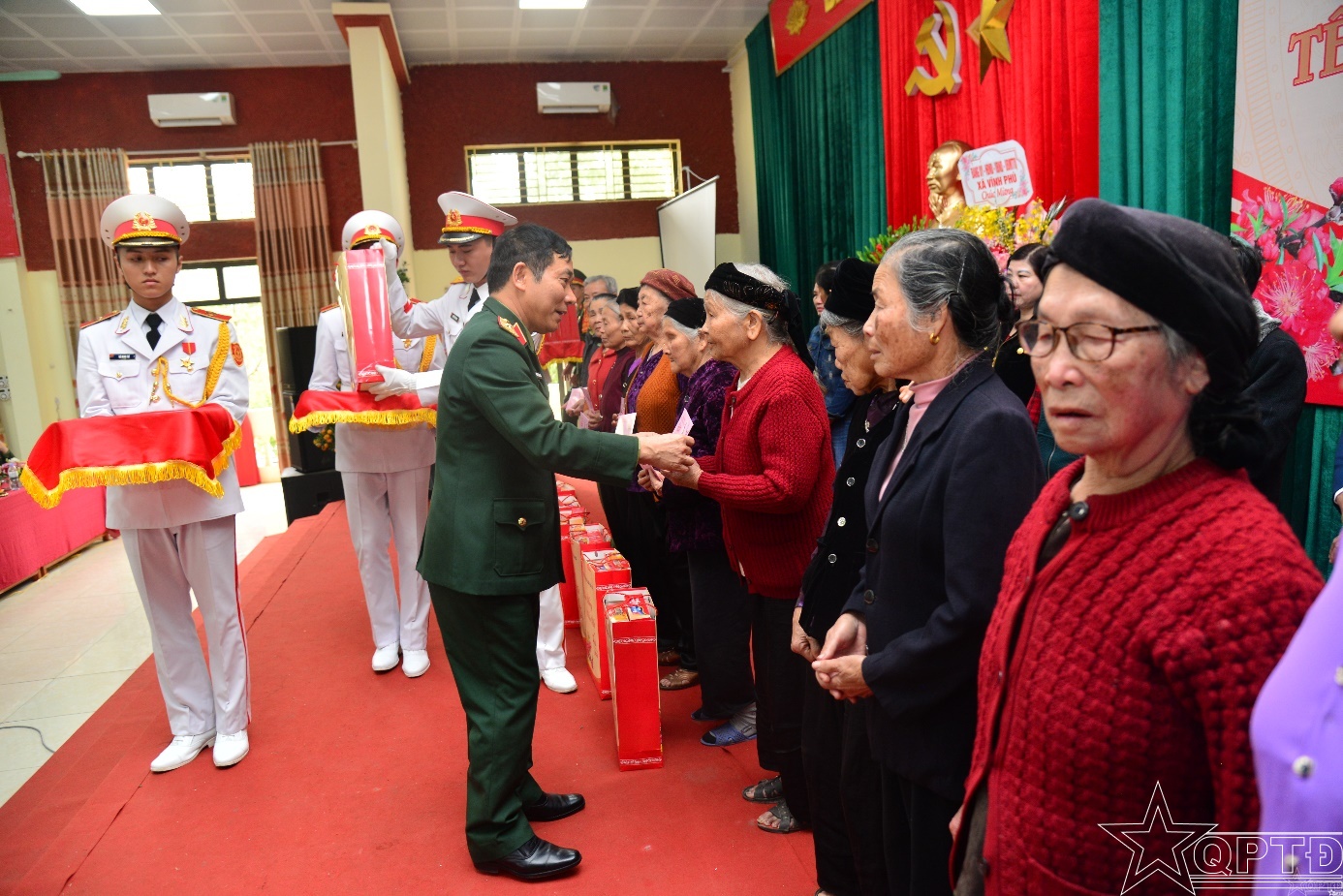 Thiếu tướng Nguyễn Khắc Nhân, Phó Chính uỷ Bộ Tư lệnh Thủ đô Hà Nội tặng quà các đối tượng chính sách.
