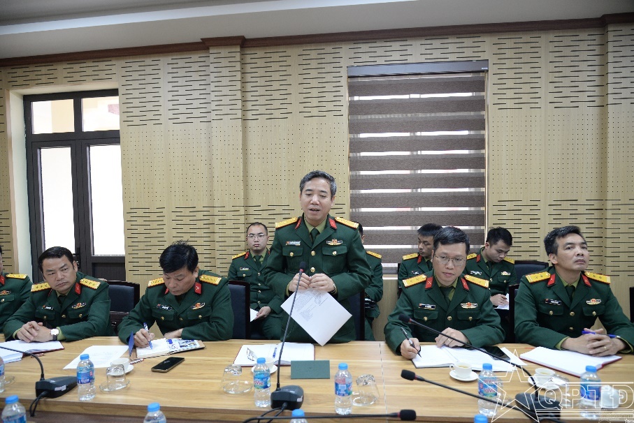 Đại tá Nguyễn Hồng Dương, Phó Chủ nhiệm Chính trị Bộ Tư lệnh Thủ đô Hà Nội phát biểu tại Hội nghị.