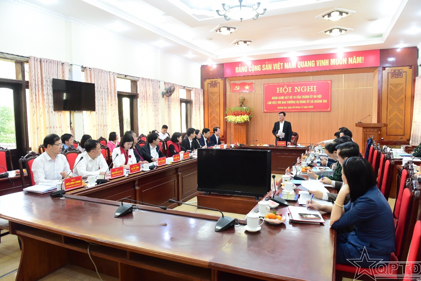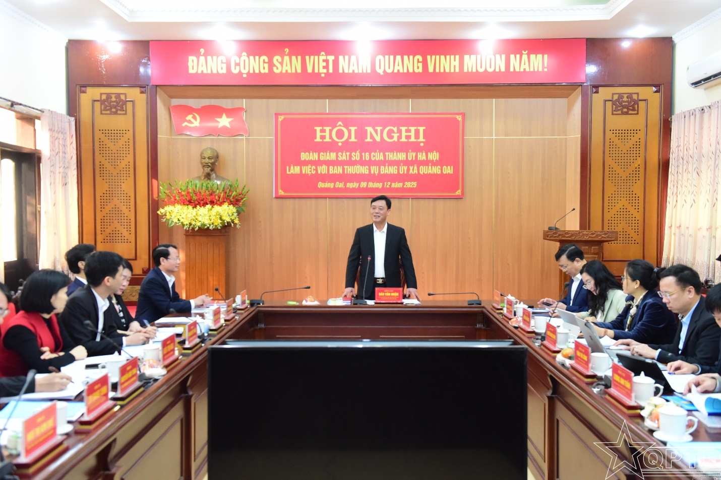 QPTĐ-Sáng ngày 9-12, Đoàn Giám sát số 16 của Ban Thường vụ Thành ủy Hà Nội, do Thiếu tướng Đào Văn Nhận, Ủy viên Ban Thường vụ Thành ủy, Phó Bí thư Đảng ủy, Tư lệnh Bộ Tư lệnh Thủ đô Hà Nội làm Trưởng đoàn, đã có buổi làm việc với Ban Thường vụ Đảng ủy xã Quảng Oai về công tác lãnh đạo, chỉ đạo tổ chức thực hiện một số vấn đề trọng tâm, cấp bách cuối năm 2025.