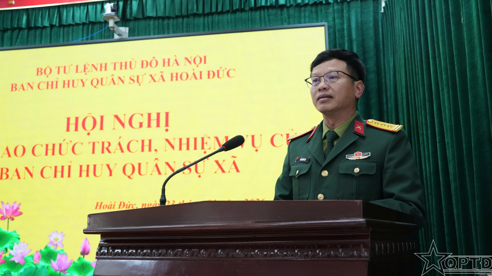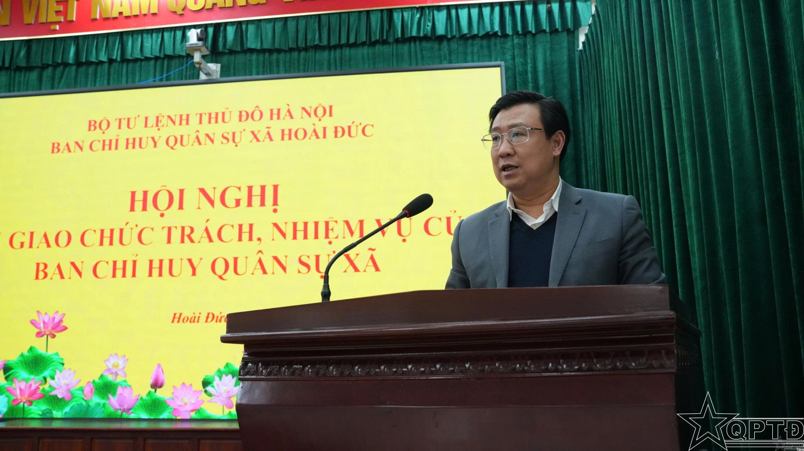 Phát biểu chỉ đạo, giao nhiệm vụ tại hội nghị, các đồng chí Nguyễn Thanh Bình, Bí thư Đảng ủy, Chủ tịch HĐND xã Hoài Đức ghi nhận và đánh giá cao những kết quả mà Ban CHQS xã đã đạt được trong thời gian qua, đặc biệt là vai trò tham mưu hiệu quả cho cấp ủy, chính quyền xã trong lãnh đạo, chỉ đạo thực hiện nhiệm vụ quốc phòng - quân sự địa phương, góp phần giữ vững an ninh chính trị, trật tự an toàn xã hội trên địa bàn. Đồng chí Bí thư Đảng ủy xã đề nghị đồng chí nhận bàn giao tiếp tục phát huy tinh thần trách nhiệm, nhanh chóng nắm bắt tình hình địa bàn, kế thừa kinh nghiệm của người tiền nhiệm; chủ động tham mưu cho Đảng ủy, UBND xã trong công tác quốc phòng - quân sự; xây dựng lực lượng dân quân vững mạnh, rộng khắp, đáp ứng yêu cầu nhiệm vụ trong tình hình mới.