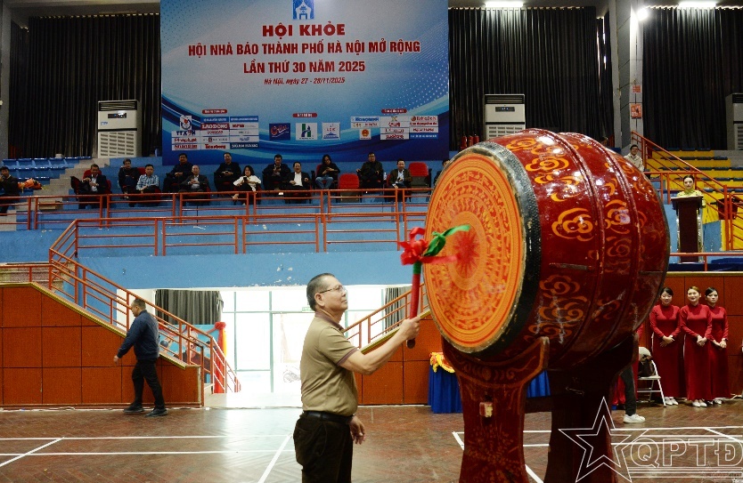 Chủ tịch Hội Nhà báo thành phố Hà Nội đánh trống khai mạc Hội khỏe.