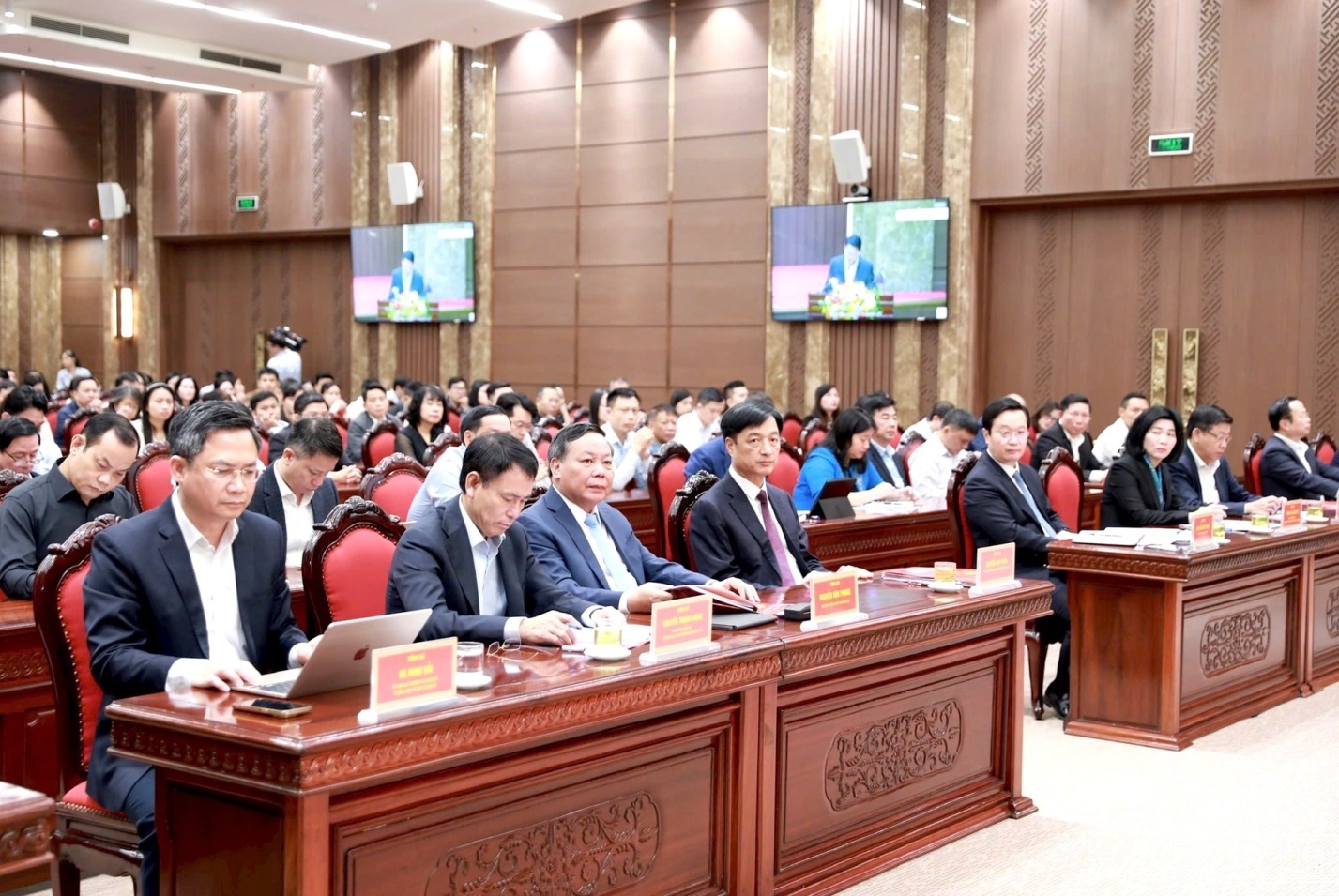Các đại biểu dự điểm cầu Thành ủy Hà Nội.