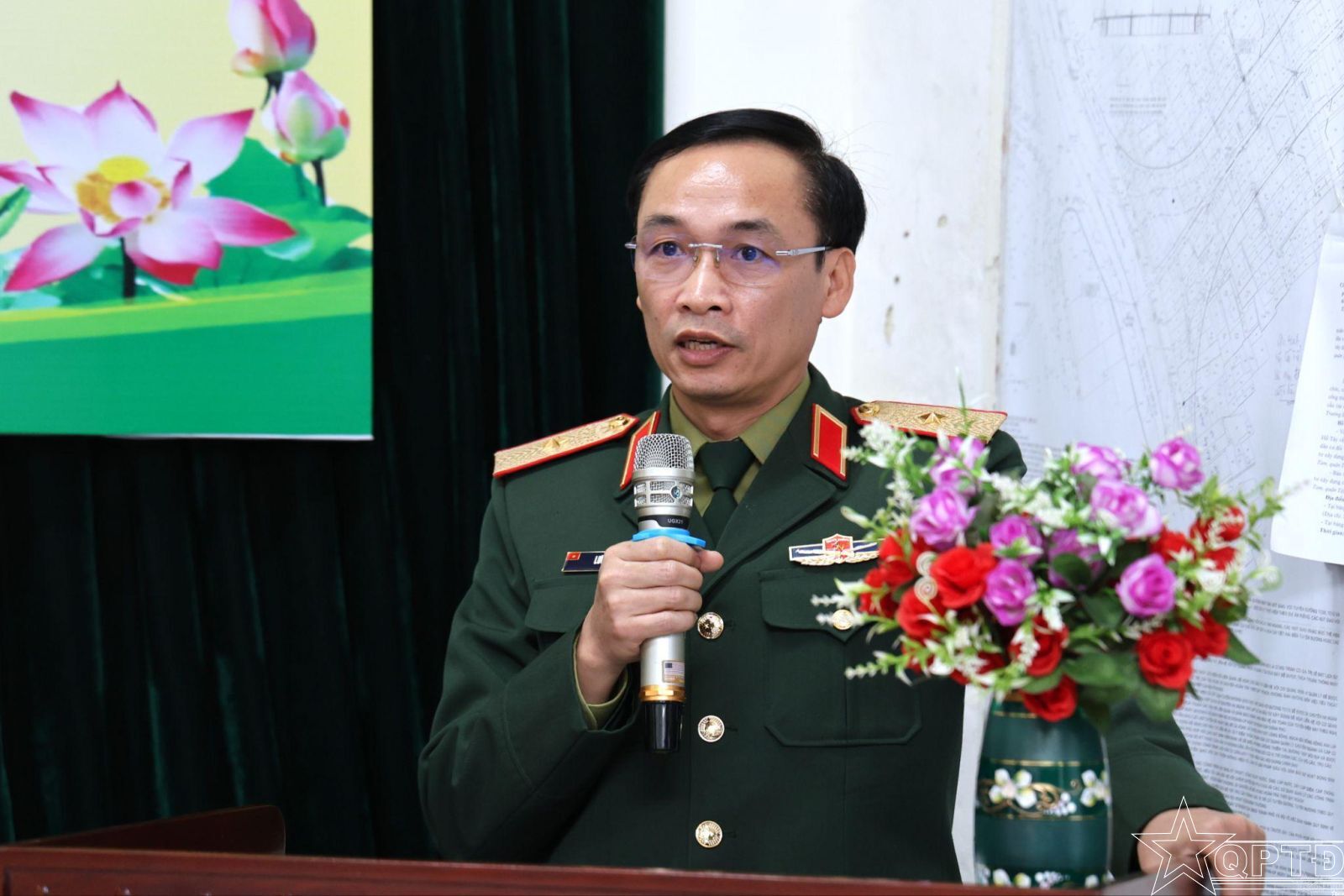 Thiếu tướng Lưu Nam Tiến, Thành ủy viên, Phó Bí thư Thường trực Đảng ủy, Chính ủy Bộ Tư lệnh Thủ đô Hà Nội phát biểu tại Hội nghị.
