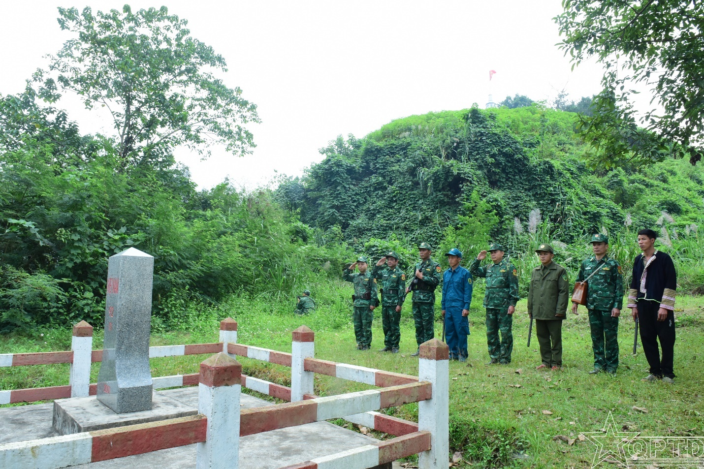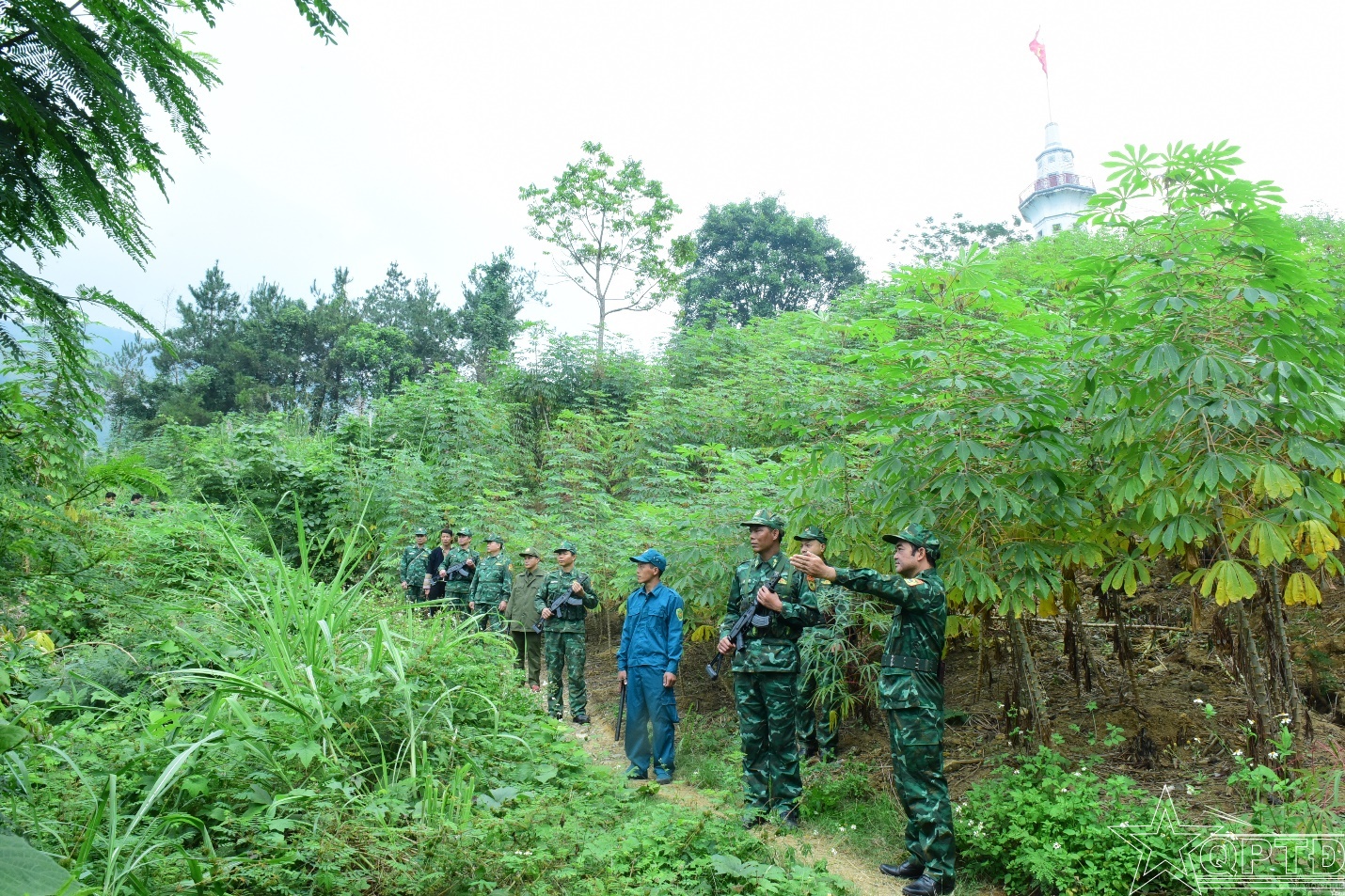 Cán bộ, chiến sĩ Đồn Biên phòng A Mú Sung phối hợp với dân quân địa phương tuần tra biên giới.
