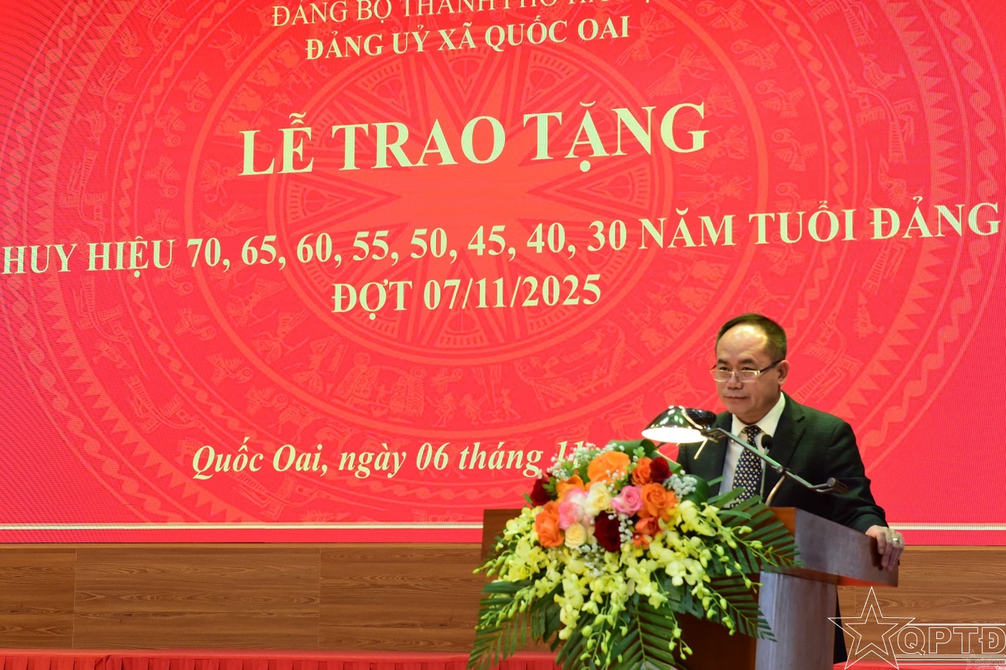 Phát biểu tại buổi Lễ, Trung tướng Nguyễn Thanh Tùng gửi lời chúc mừng nồng nhiệt tới các đảng viên được nhận Huy hiệu Đảng đợt này, đồng thời nhấn mạnh: Mỗi tấm Huy hiệu Đảng đều là biểu tượng cao quý của lòng trung thành, kiên định, của niềm tin không lay chuyển đối với Đảng, Tổ quốc và nhân dân. Đó là phần thưởng thiêng liêng, là minh chứng cho cả một quá trình rèn luyện, cống hiến và trưởng thành trong hàng ngũ của Đảng. Các đồng chí đảng viên được tặng Huy hiệu Đảng ngày hôm nay, nhất là các đồng chí được tặng Huy hiệu 60 năm, 65 năm và 70 năm tuổi Đảng đều là những đảng viên sớm giác ngộ cách mạng, đi theo tiếng gọi của Đảng, Bác Hồ kính yêu, được kết nạp vào Đảng Cộng sản Việt Nam khi tuổi đời còn trẻ. Quá trình công tác của các đồng chí dù ở đâu và trên cương vị nào cũng luôn luôn giữ vững bản lĩnh chính trị, phẩm chất và nêu cao tinh thần cách mạng, luôn gương mẫu phấn đấu vươn lên, nêu cao vai trò trách nhiệm của người đảng viên, hết lòng phụng sự Tổ quốc, phục vụ nhân dân, hoàn thành tốt nhiệm vụ được giao. Nhiều đồng chí khi tuổi cao, được nghỉ theo chế độ của Nhà nước, song vẫn tích cực tham gia các hoạt động, gương mẫu đi đầu trong nhiều lĩnh vực, đã cùng chung sức, đồng lòng với Đảng bộ, chính quyền địa phương nơi sinh hoạt và cư trú, đóng góp xây dựng, góp phần hoàn thành tốt nhiệm vụ chính trị và thành công chung của Đảng bộ, chính quyền xã Quốc Oai nói riêng và Thủ đô nói chung. Sự kiên trung, gương mẫu của các đồng chí là nguồn động viên to lớn để thế hệ trẻ noi theo, tiếp bước trên con đường cách mạng mà Đảng và Bác Hồ đã chọn.