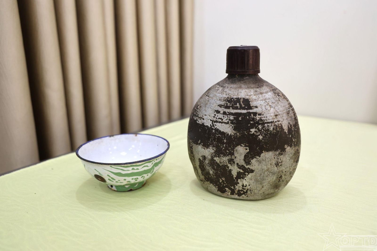 Hai hiện vật là bát sắt và bi-đông đựng nước của đồng chí Vũ Văn Huynh, Anh hùng Lực lượng vũ trang nhân dân.