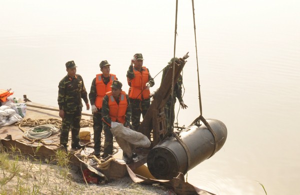 Lực lượng công binh trục vớt quả bom nặng 1.350kg dưới chân cầu Long Biên (Hà Nội).