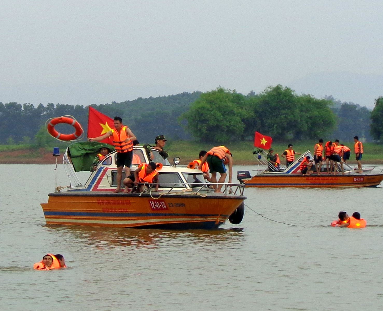 Cán bộ, chiến sĩ Trung đoàn 692, Sư đoàn Bộ binh 301 huấn luyện cứu hộ, cứu nạn trên hồ Đồng Mô.