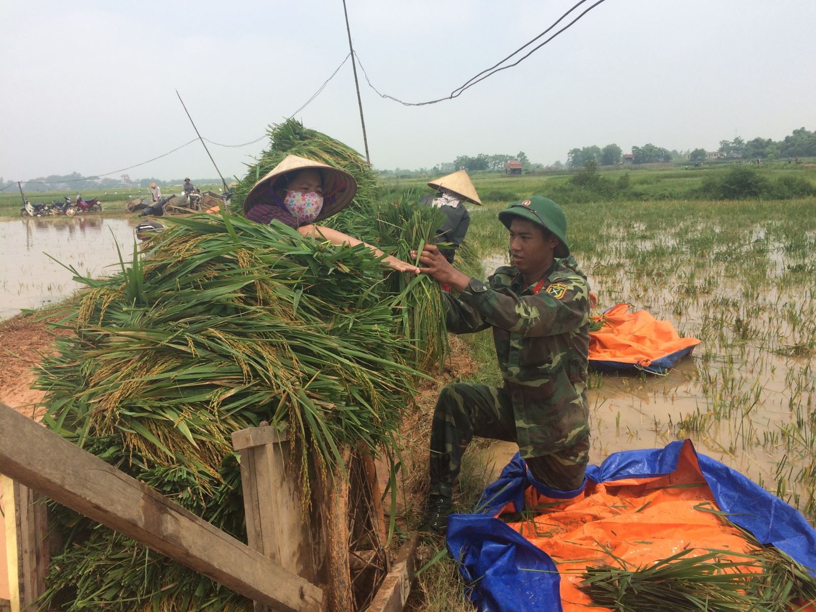 Chiến sĩ mới Tiểu đoàn 7, Trung đoàn 692 giúp nhân dân thôn Cấn Thượng, xã Cấn Hữu, huyện Quốc Oai, Hà Nội gặt lúa chống úng.