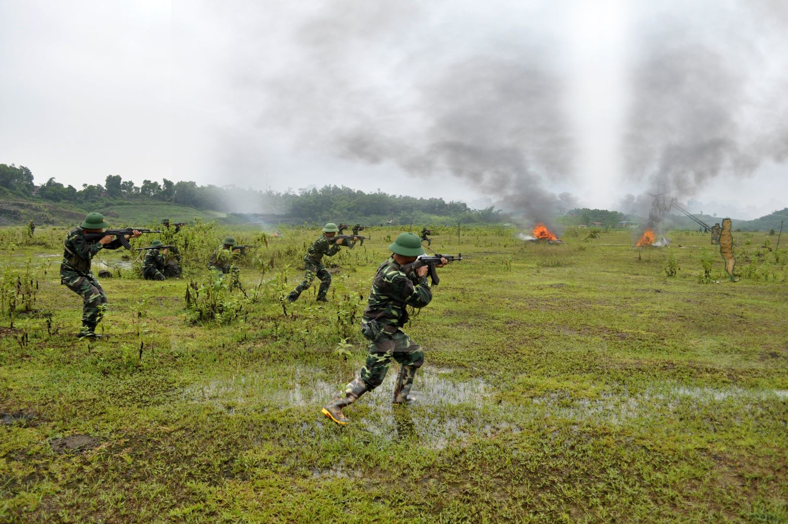 Bước vào phần diễn tập thực binh, lực lượng dân quân tự vệ, Tiểu đoàn bộ đội địa phương huyện, công an, thanh niên được huy động cùng các loại vũ khí trang bị, phương tiện vật chất tham gia xử lý tốt các tình huống: Đánh bắt bọn khủng bố, giải thoát con tin gắn với tình huống chữa cháy, cứu hộ cứu nạn; đánh địch đổ bộ đường không.