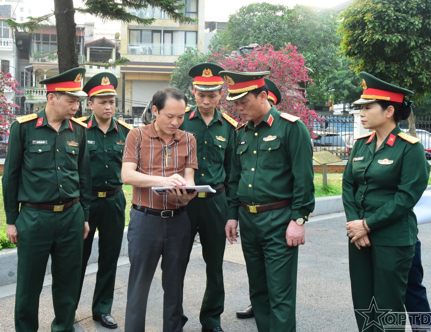 Thủ trưởng Bộ Tư lệnh Thủ đô Hà Nội nghe đơn vị tư vấn thuyết minh về phương án cải tạo cảnh quan xung quanh các hiện vật chiến tích ngoài trời.