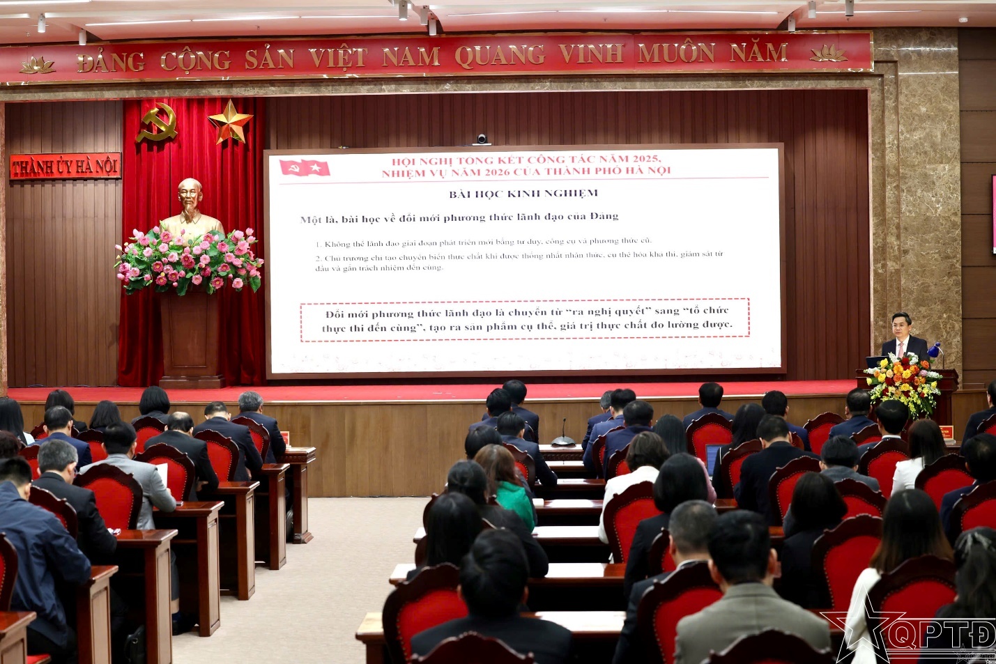 Phát biểu kết luận hội nghị, Bí thư Thành ủy Nguyễn Duy Ngọc biểu dương những nỗ lực vượt bậc của toàn hệ thống chính trị khi hoàn thành 24/24 chỉ tiêu kinh tế-xã hội chủ yếu; tăng trưởng GRDP đạt 8,16% và tổng thu ngân sách nhà nước đạt trên 668 nghìn tỷ đồng-mức cao nhất đạt được sau nhiều năm; bảo đảm quốc phòng, giữ vững an ninh chính trị, bảo vệ an toàn các mục tiêu trọng điểm và các sự kiện diễn ra trên địa bàn. Thành quả này nói lên sự cố gắng, bản lĩnh, gắn liền với những trăn trở, trách nhiệm-là điều rất đáng tự hào ở mỗi cấp, mỗi ngành. Đồng chí Bí thư chỉ đạo toàn Thành phố thực hiện nghiêm túc chủ đề năm 2026: “Kỷ cương, chuyên nghiệp-Đột phá, sáng tạo-Hiệu quả, bền vững”. Để hiện thực hóa điều này, các cấp ủy Đảng phải đổi mới phương thức lãnh đạo, cải tiến lề lối làm việc, đề cao trách nhiệm người đứng đầu và bám sát Chương trình hành động thực hiện Nghị quyết Đại hội XVIII Đảng bộ Thành phố và Nghị quyết Đại hội XIV của Đảng. Bí thư Thành ủy yêu cầu xây dựng bộ máy từ Thành phố đến cơ sở theo hướng tinh gọn, hiệu lực. Đặc biệt, công tác kiểm tra, giám sát phải chuyển từ "bị động" sang "chủ động", thực hiện phương châm: “Giám sát trên dữ liệu, kiểm tra trên dữ liệu”. Việc đánh giá cán bộ phải được thực hiện định kỳ hàng quý, gắn với giám sát thường xuyên để ngăn chặn sai phạm từ sớm, từ xa. Nhiệm vụ trọng tâm xuyên suốt là hoàn thiện thể chế và quy hoạch Thủ đô tầm nhìn 100 năm (thực hiện Luật Thủ đô 2024, Nghị quyết 15 của Bộ Chính trị). Bí thư Thành ủy nhấn mạnh: Đây không chỉ là nhiệm vụ hành chính mà là "danh dự và trách nhiệm", yêu cầu các cấp, các ngành phải hành động thực chất, tập trung trí tuệ cao nhất để trình Bộ Chính trị, Chính phủ và Quốc hội đúng thời hạn….