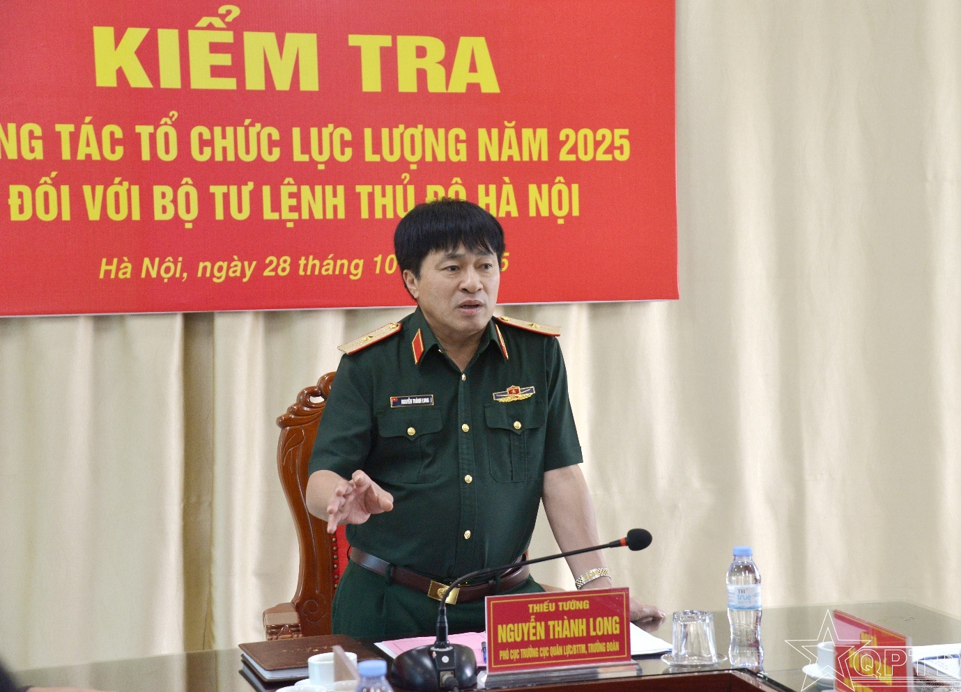 QPTĐ-Ngày 28-10, Đoàn công tác Cục Quân lực, Bộ Tổng tham mưu Quân đội nhân dân Việt Nam do Thiếu tướng Nguyễn Thành Long, Phó Cục trưởng Cục Quân lực làm Trưởng đoàn đã tiến hành kiểm tra công tác tổ chức lực lượng năm 2025 tại Ban Chỉ huy phòng thủ khu vực 5-Thanh Oai và Sư đoàn Bộ binh 301, Bộ Tư lệnh Thủ đô Hà Nội. Tiếp và làm việc cùng với Đoàn có Thiếu tướng Nguyễn Đình Thạo, Phó Tư lệnh-Tham mưu trưởng Bộ Tư lệnh Thủ đô Hà Nội.