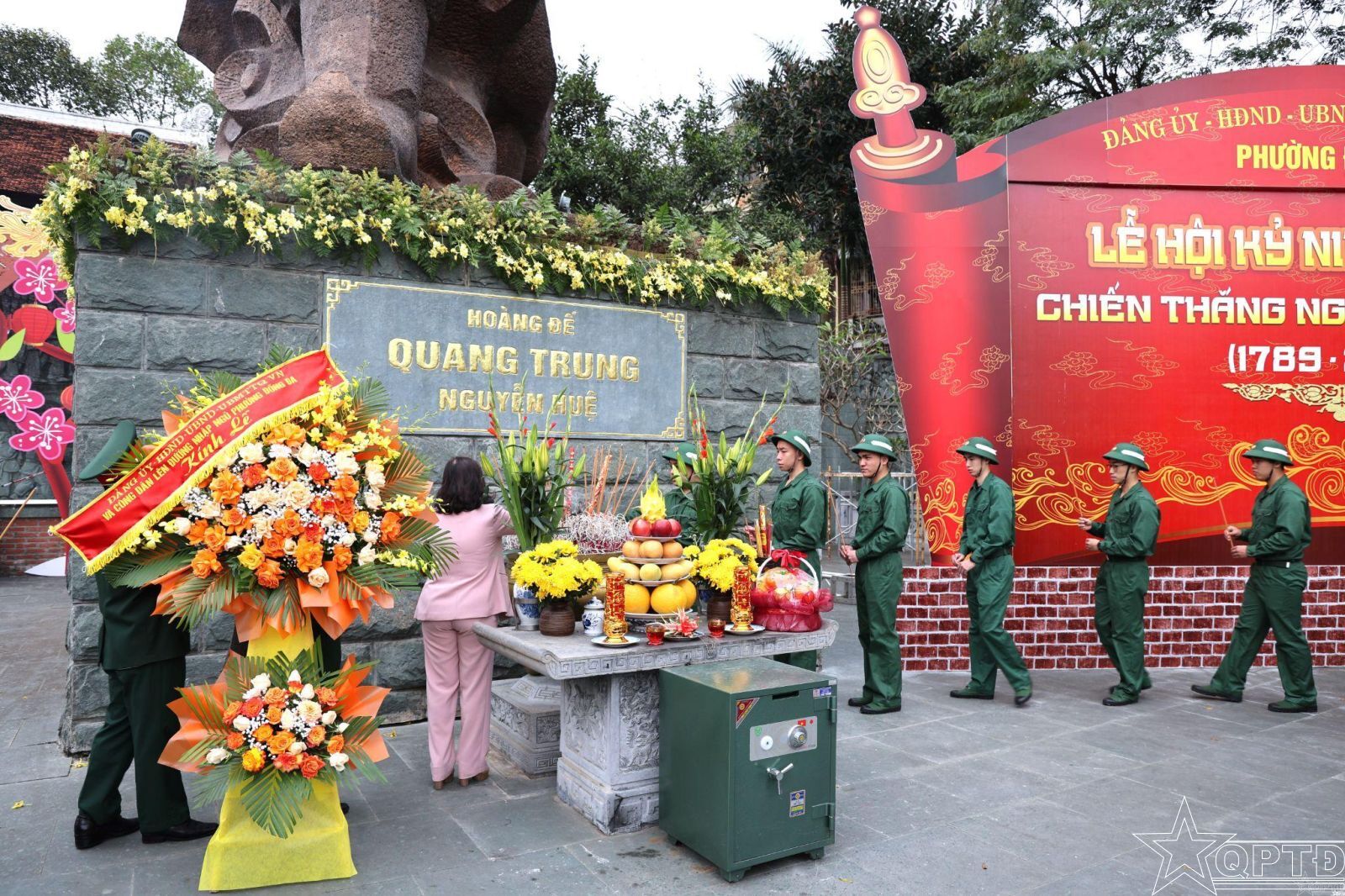 Các đồng chí lãnh đạo, đại biểu cùng toàn thể các tân binh và quân nhân xuất ngũ phường Đống Đa đã thực hiện nghi lễ dâng hương, báo công tại tượng đài Vua Quang Trung, trong khuôn viên Di tích Quốc gia đặc biệt Gò Đống Đa.